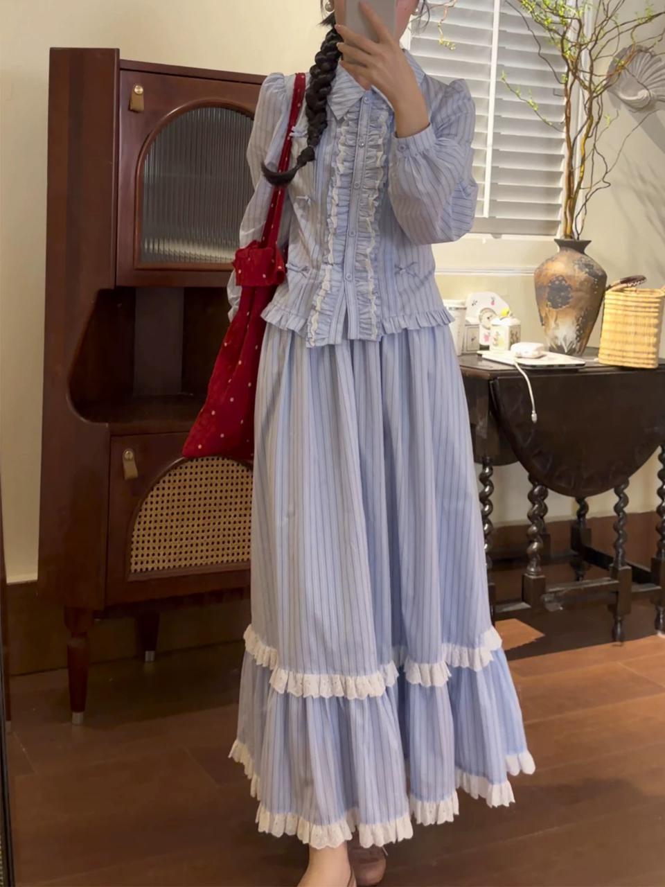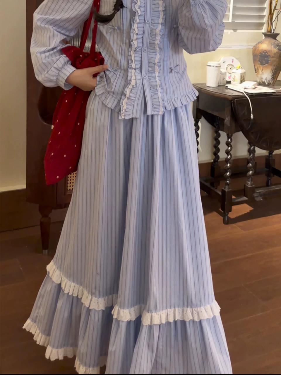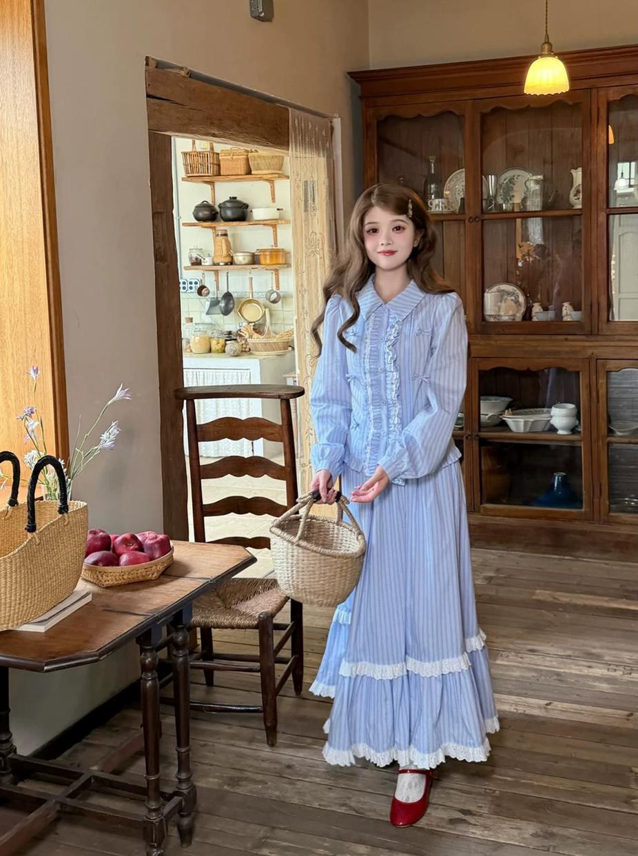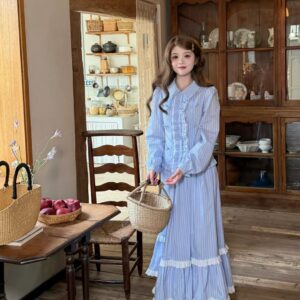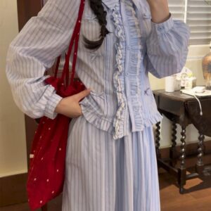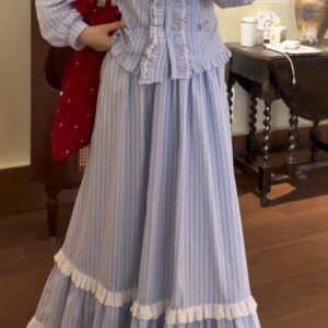 التصميم: طقم مكون من قطعتين بنقشة الخطوط العمودية الكلاسيكية (Pinstripe). يتميز القميص بياقة “بيتر بان” مع كشكشة ناعمة (Ruffles) على طول الصدر وأربطة “فيونكة” صغيرة على الجانبين. التنورة طويلة واسعة (A-line) بطبقات متعددة (Tiered) مزينة باطار من الدانتيل الأبيض المخرم