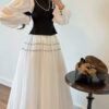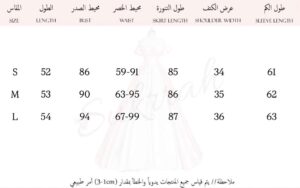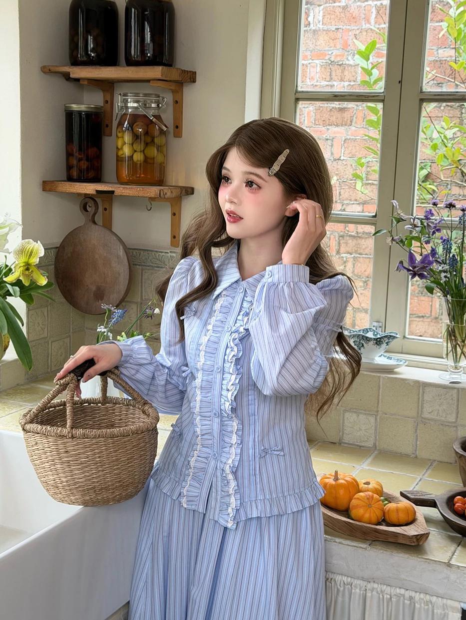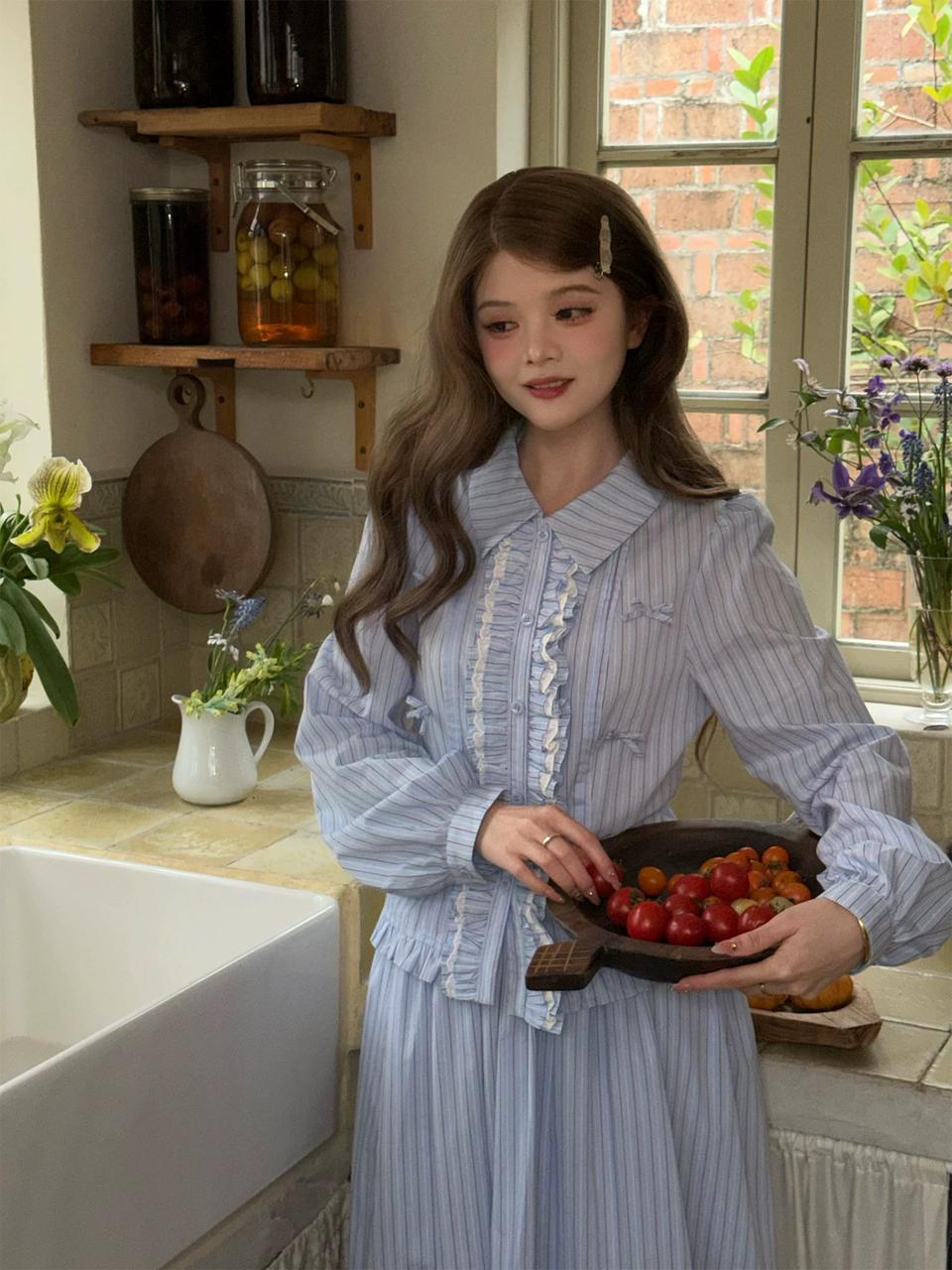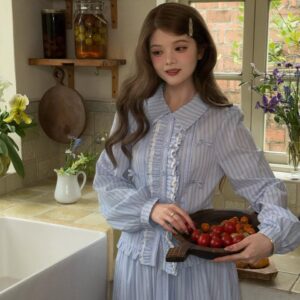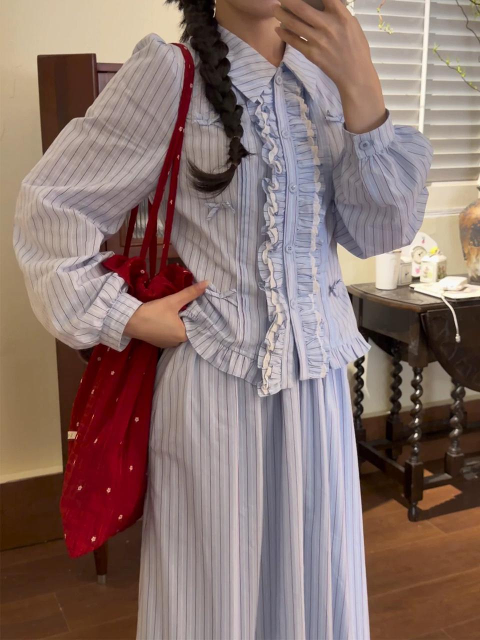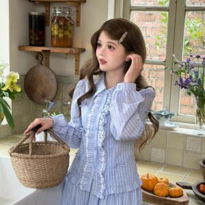 التصميم: طقم مكون من قطعتين بنقشة الخطوط العمودية الكلاسيكية (Pinstripe). يتميز القميص بياقة “بيتر بان” مع كشكشة ناعمة (Ruffles) على طول الصدر وأربطة “فيونكة” صغيرة على الجانبين. التنورة طويلة واسعة (A-line) بطبقات متعددة (Tiered) مزينة باطار من الدانتيل الأبيض المخرم