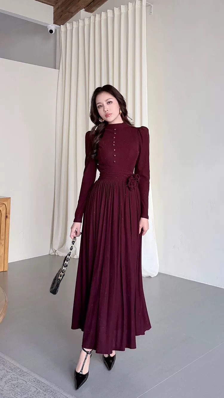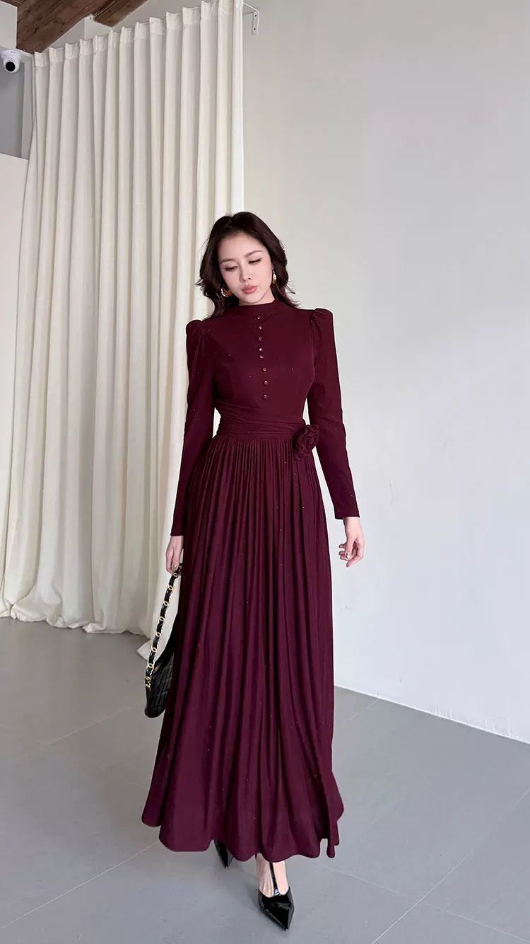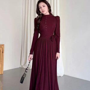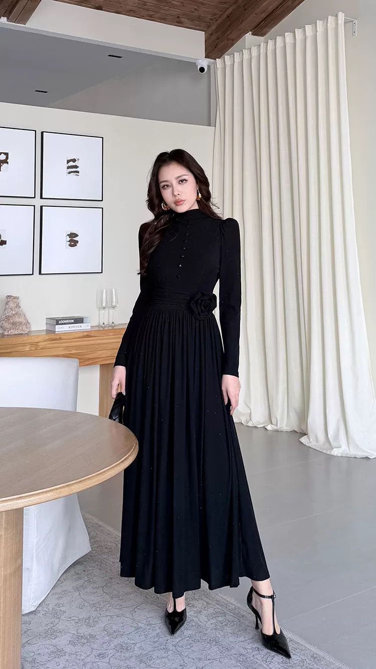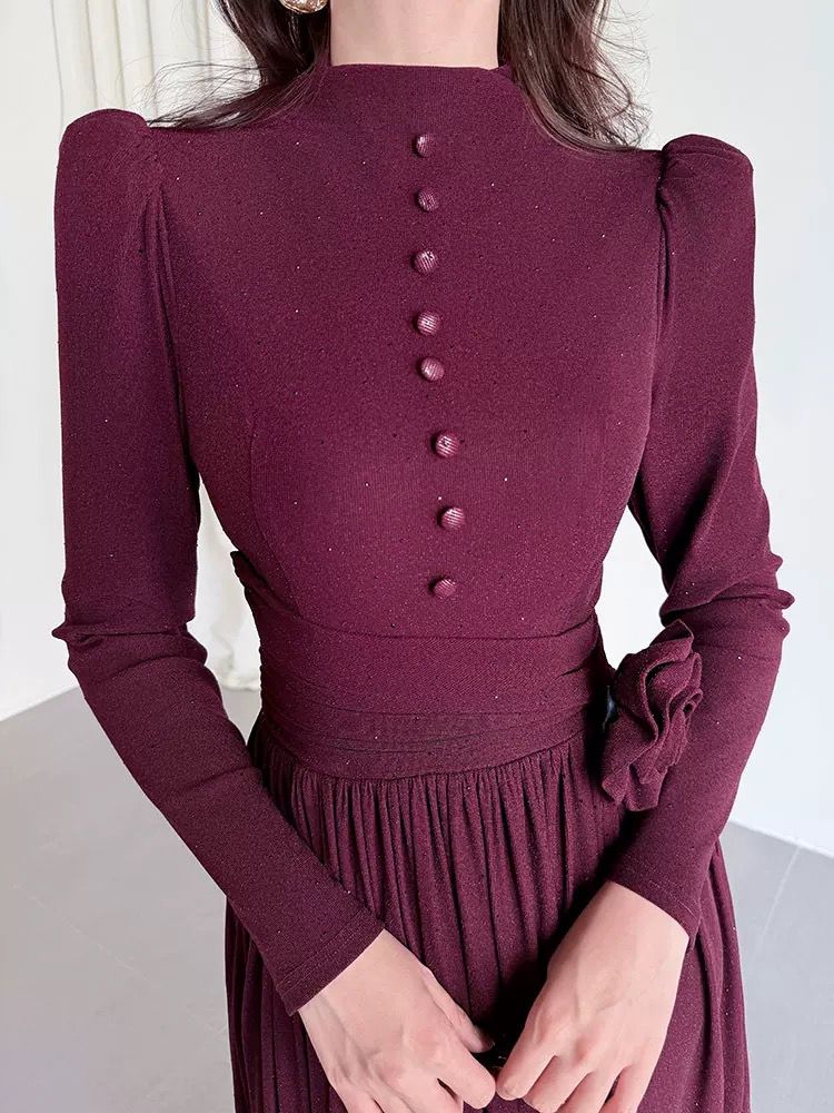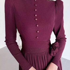 التصميم: فستان طويل بياقة مرتفعة (High Neck) مزين بصف من الأزرار المغطاة من نفس القماش على الصدر. يتميز بخصر محدد بكسرات عريضة تبرز القوام، مع وردة جانبية بارزة (3D Flower) تضفي لمسة فنية. القماش يحتوي على حبيبات براقة ناعمة تمنحه بريقاً خفيفاً.
