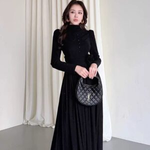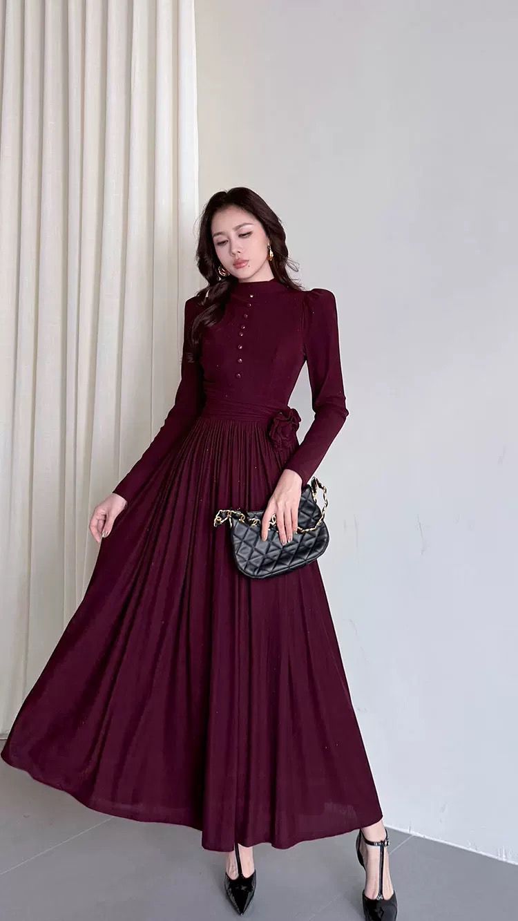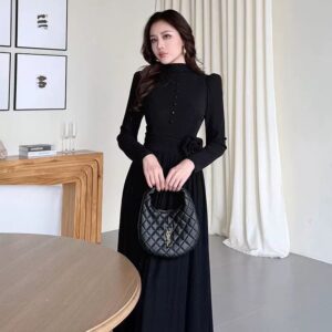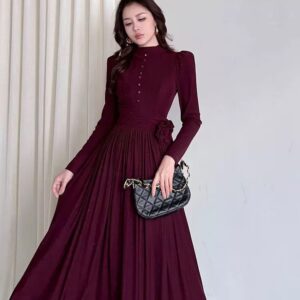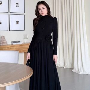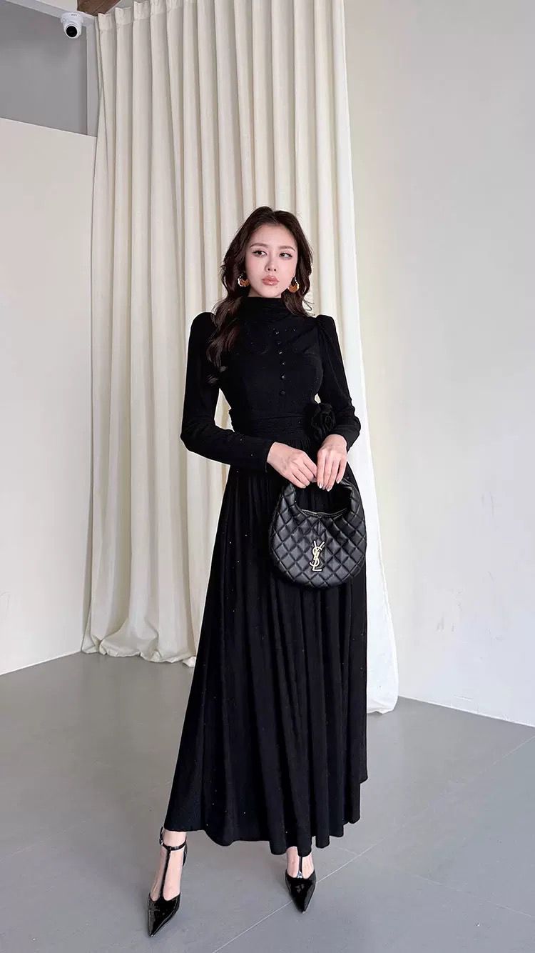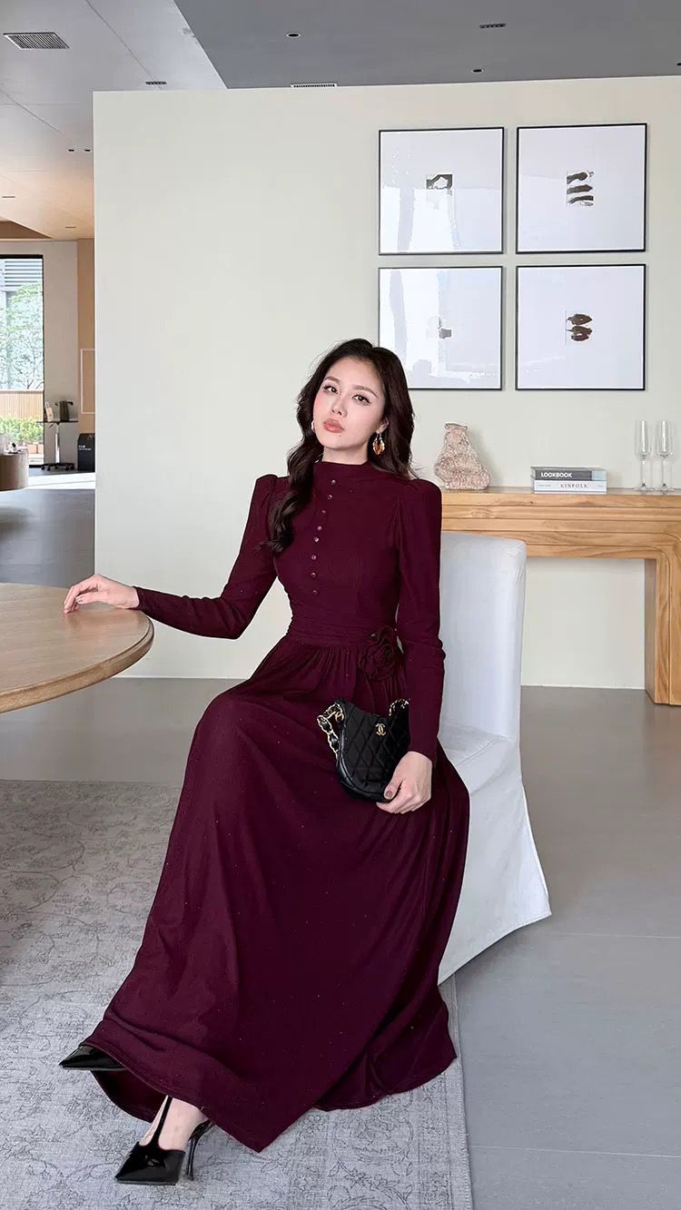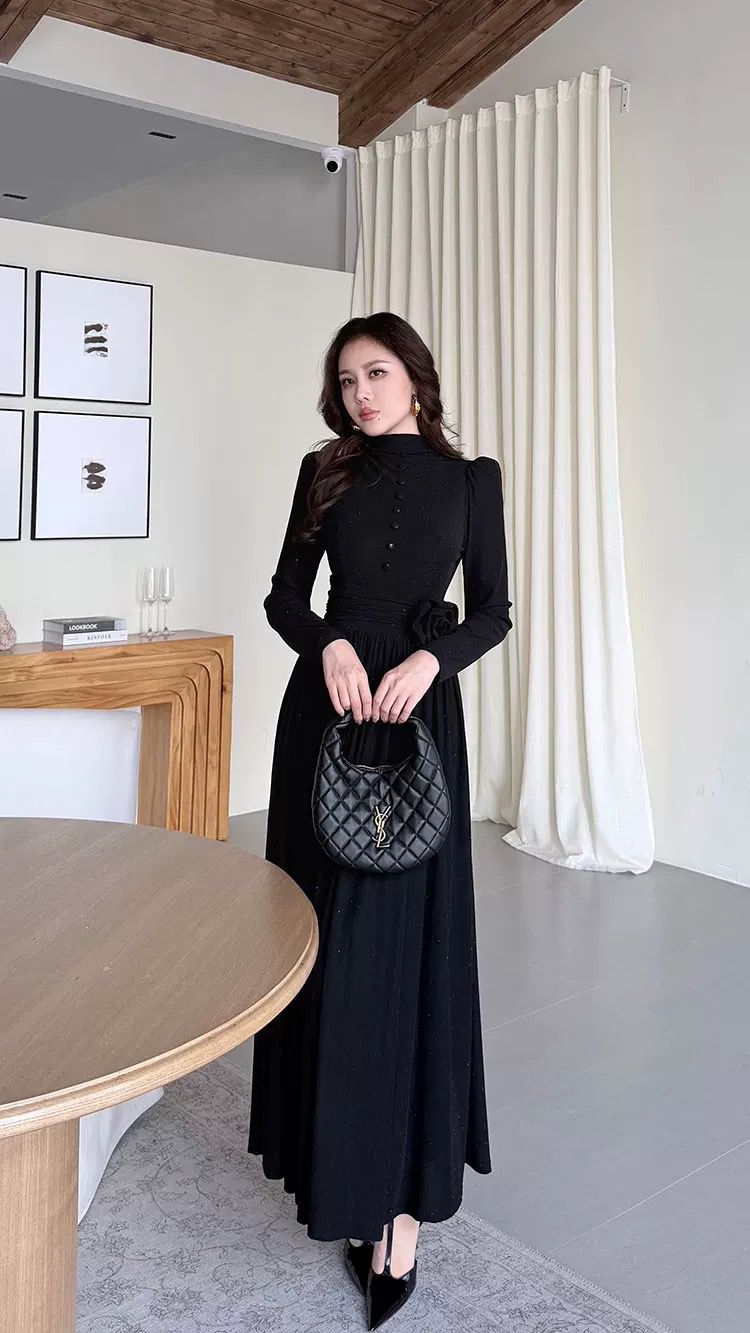 التصميم: فستان طويل بياقة مرتفعة (High Neck) مزين بصف من الأزرار المغطاة من نفس القماش على الصدر. يتميز بخصر محدد بكسرات عريضة تبرز القوام، مع وردة جانبية بارزة (3D Flower) تضفي لمسة فنية. القماش يحتوي على حبيبات براقة ناعمة تمنحه بريقاً خفيفاً.