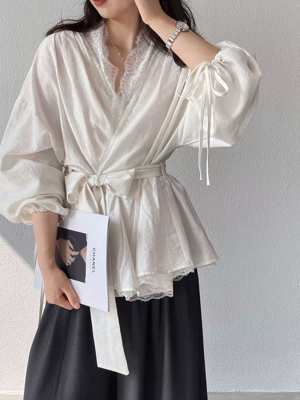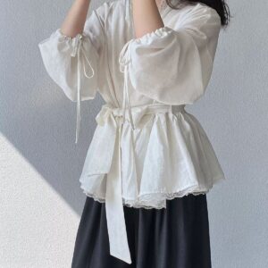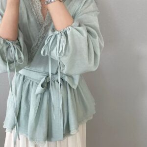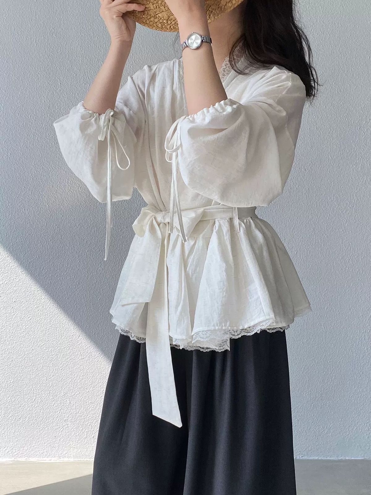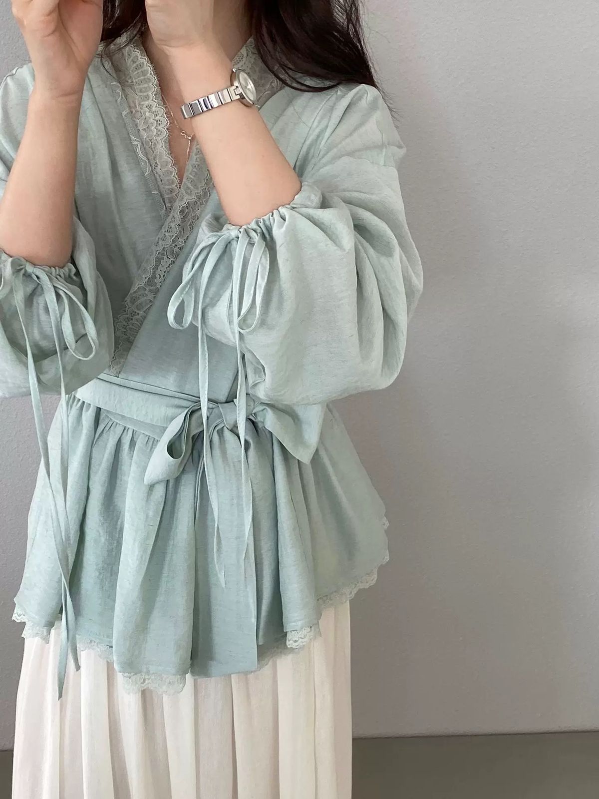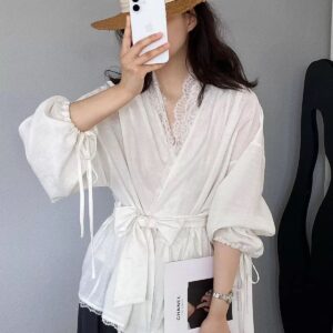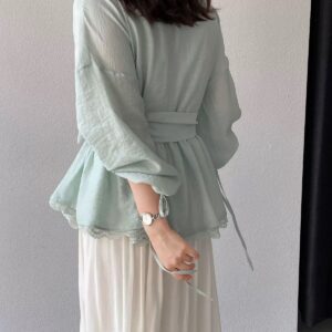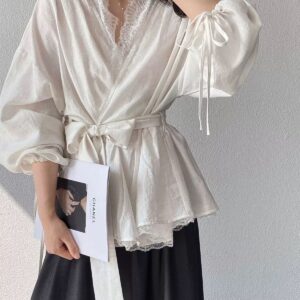 التصميم: قميص بنظام لف (Wrap Top) يتميز بفتحة صدر على شكل حرف V مزينة بكنار من الدانتيل الفاخر. يتضمن أكماماً واسعة (Puff Sleeves) تنتهي بأربطة رفيعة، مع حزام عريض من نفس القماش يحدد الخصر ويبرز القوام، وينتهي بطبقة سفلية من الدانتيل تضفي لمسة من الفخامة.