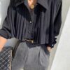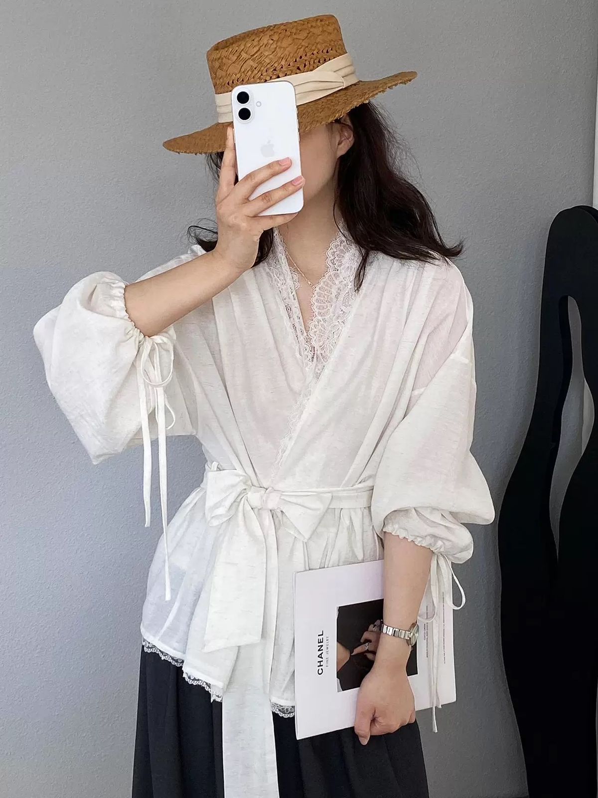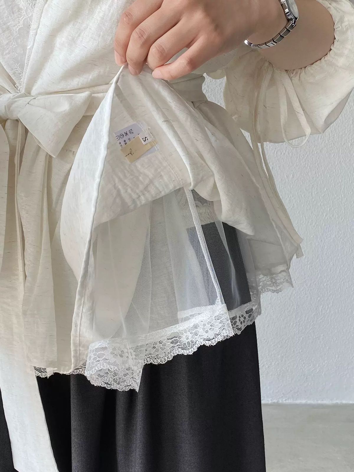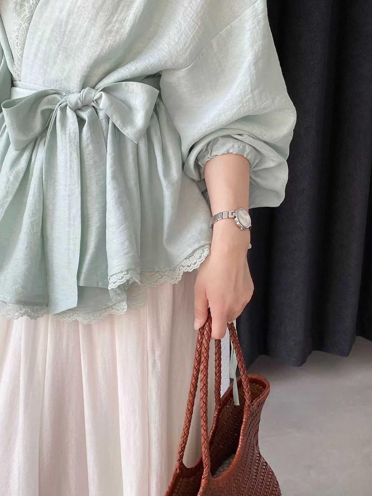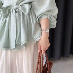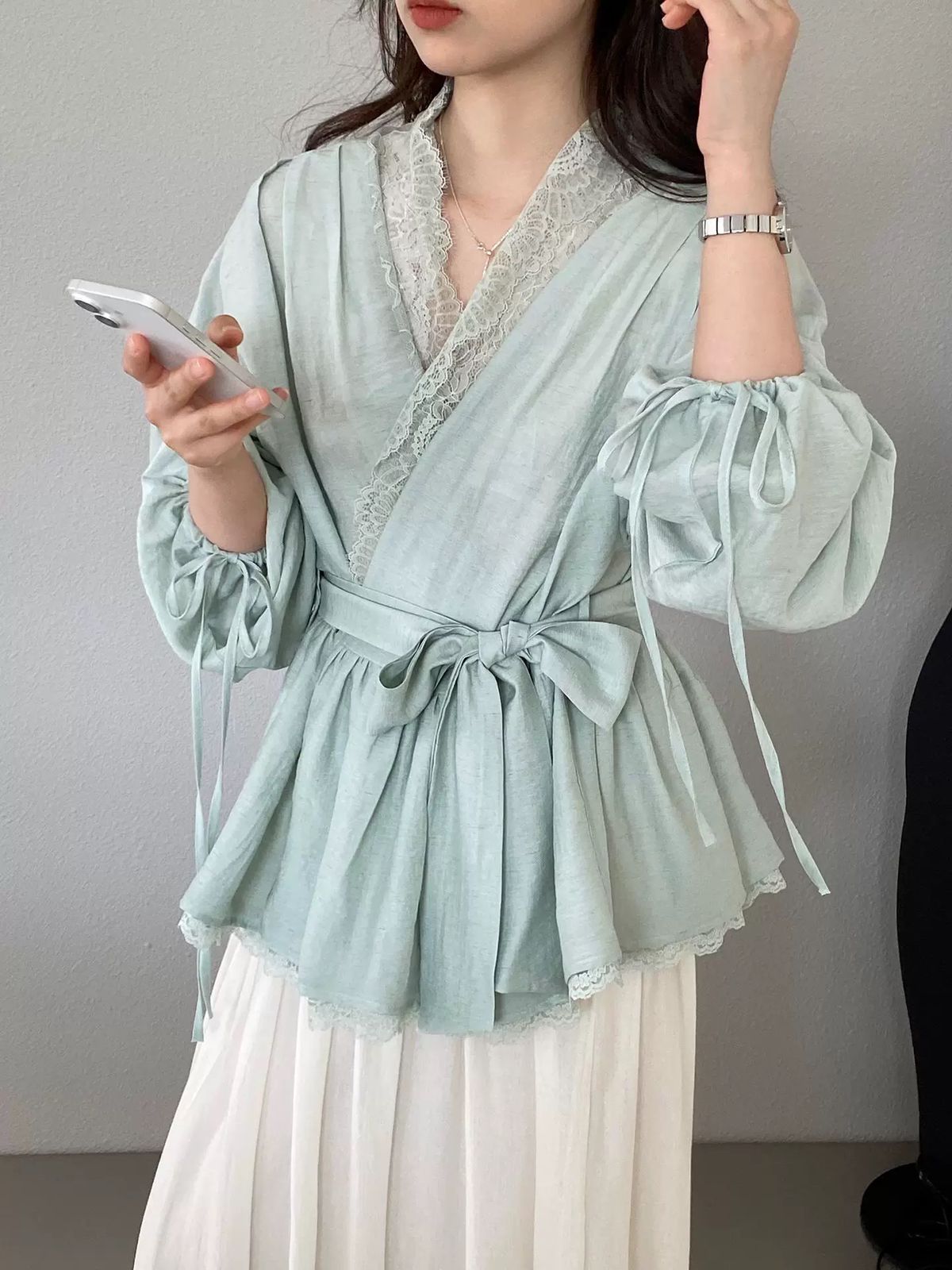 التصميم: قميص بنظام لف (Wrap Top) يتميز بفتحة صدر على شكل حرف V مزينة بكنار من الدانتيل الفاخر. يتضمن أكماماً واسعة (Puff Sleeves) تنتهي بأربطة رفيعة، مع حزام عريض من نفس القماش يحدد الخصر ويبرز القوام، وينتهي بطبقة سفلية من الدانتيل تضفي لمسة من الفخامة.