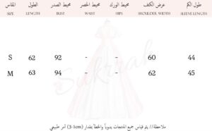 طول الأكمام: أكمام طويلة واسعة؛ تتميز بمرونة في المعصم بفضل الأربطة، مما يسمح بتعديل شكلها (مزمومة أو مفتوحة).