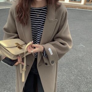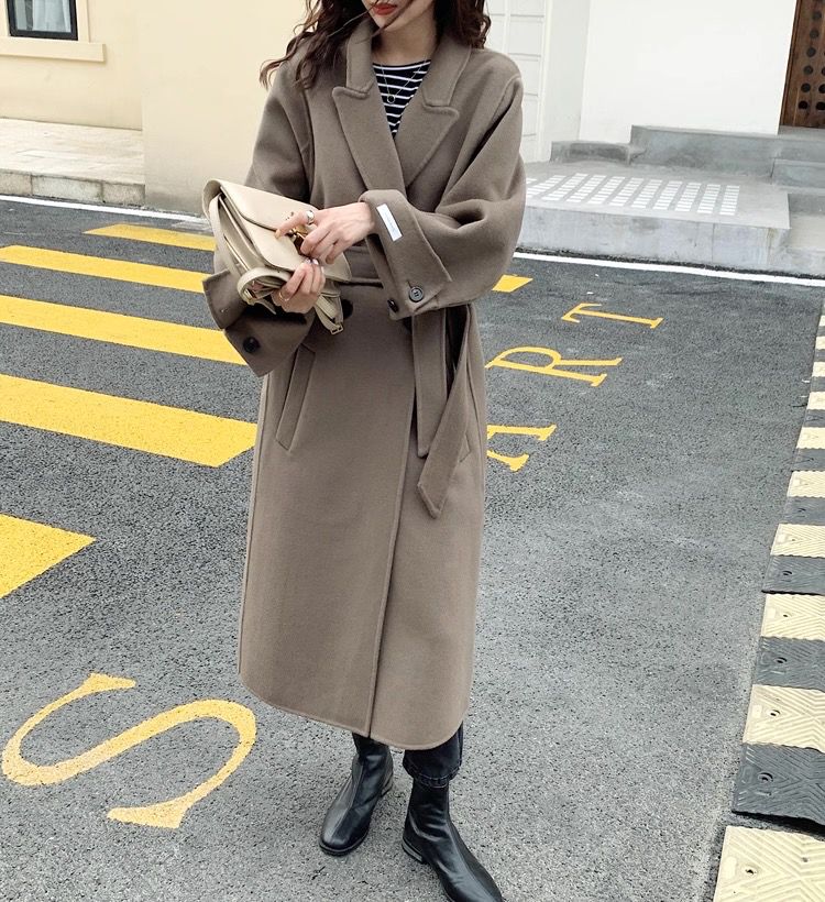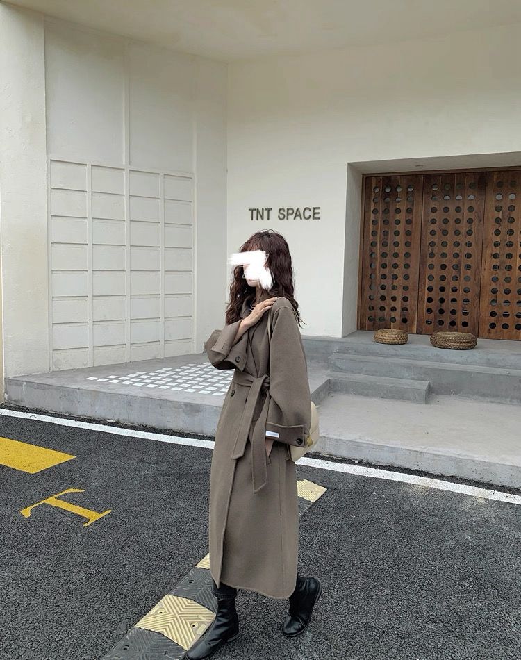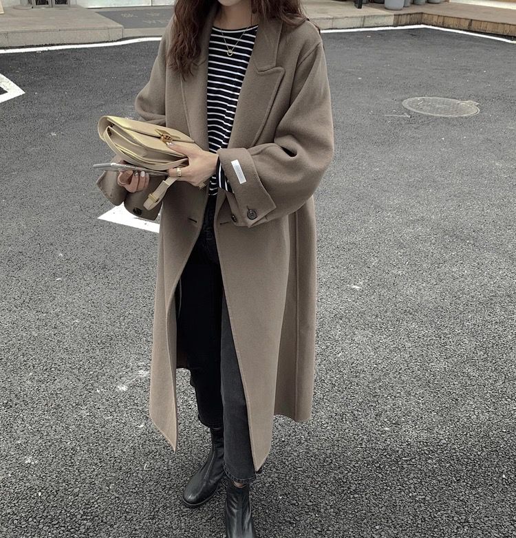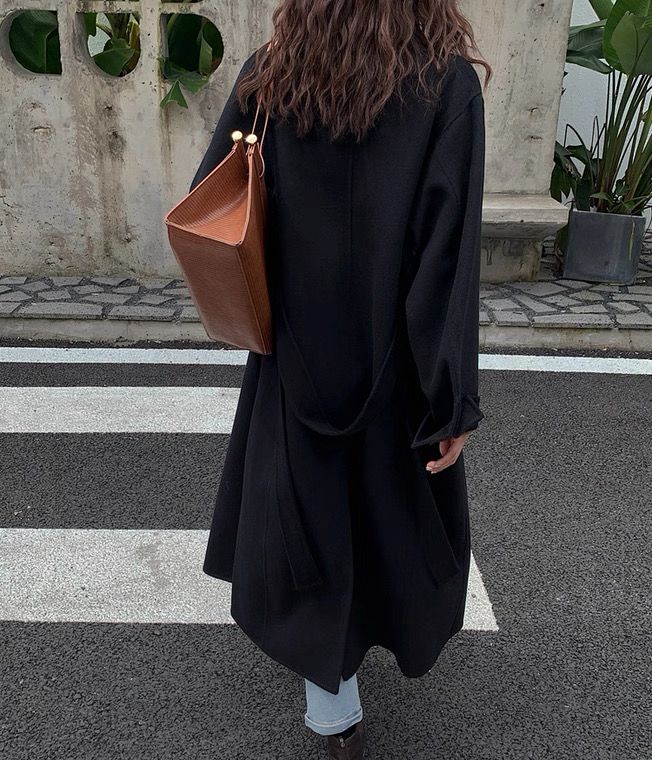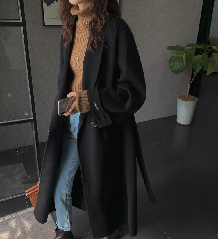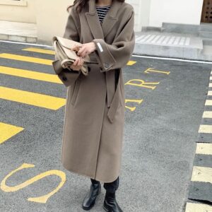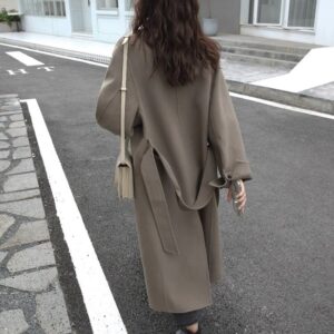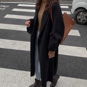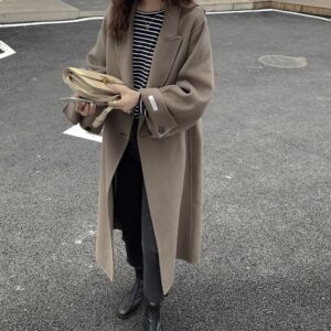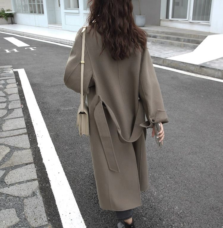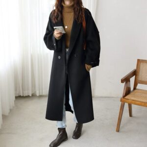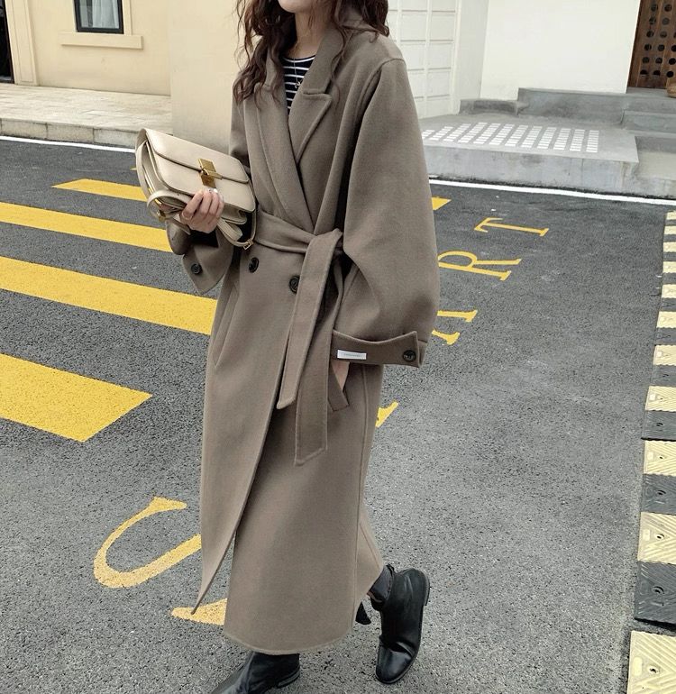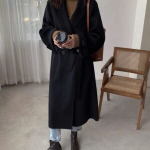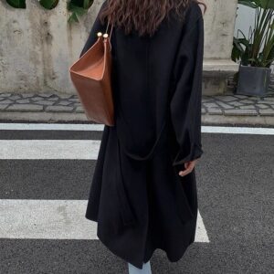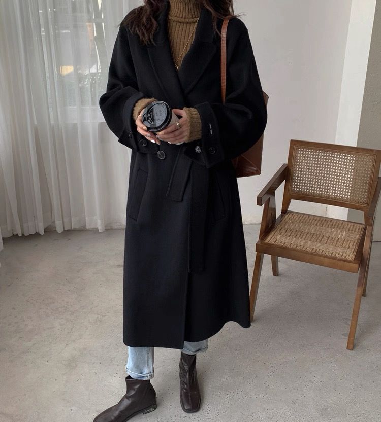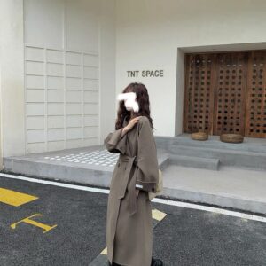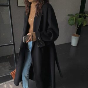 التصميم: حزام ربط ذاتي عريض من نفس قماش المعطف للخصر، يمنحه مظهراً ملفوفاً ومحدداً. له صف مزدوج من الأزرار, أكمام واسعة مع تفصيل عند المعصم يُثبت بزر.