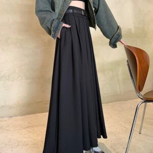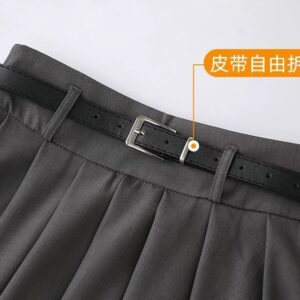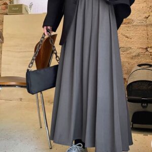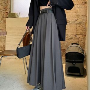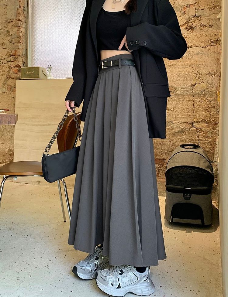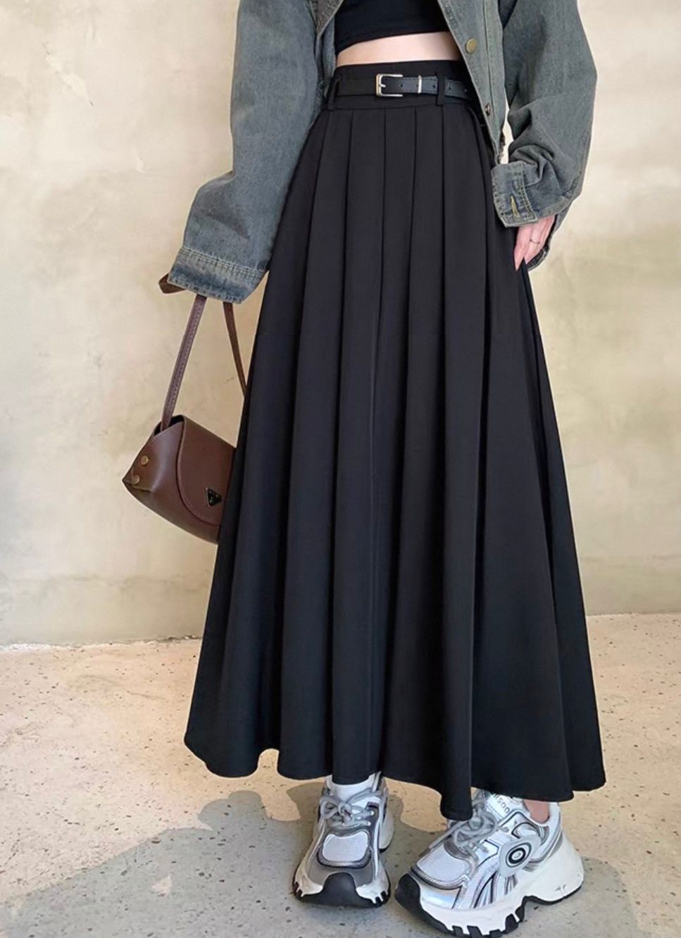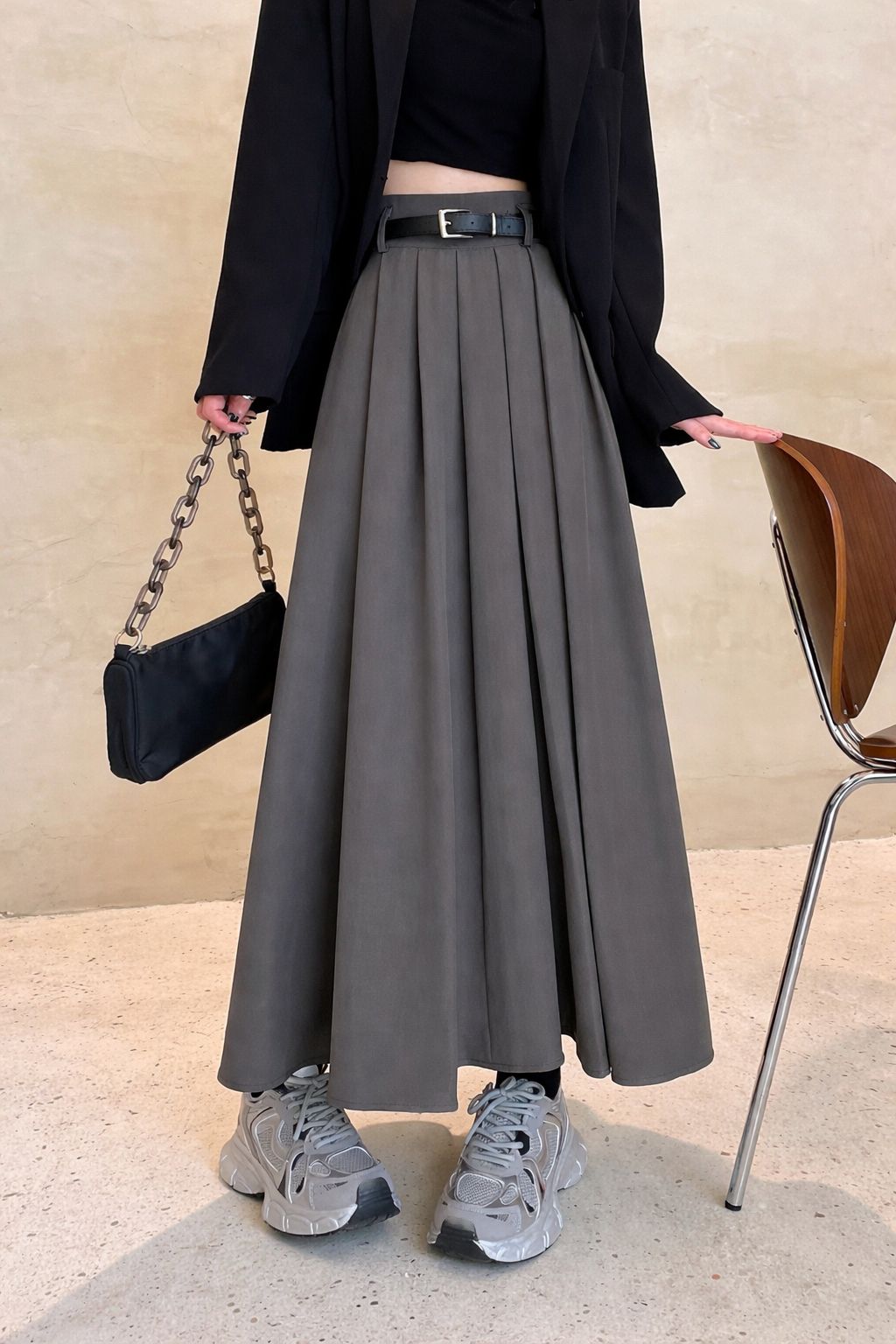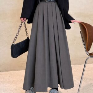 التصميم: تنورة بكسرات (Pleated) عريضة وواضحة، تأتي بقصة A-line (على شكل حرف A) التي تبرز الخصر وتنسدل باتجاه الأسفل، مع تصميم خصر مرتفع مزود بحلقات للحزام وحزام جلدي نحيف لإعطاء مظهر أكثر تحديداً.