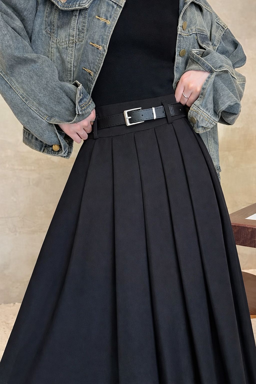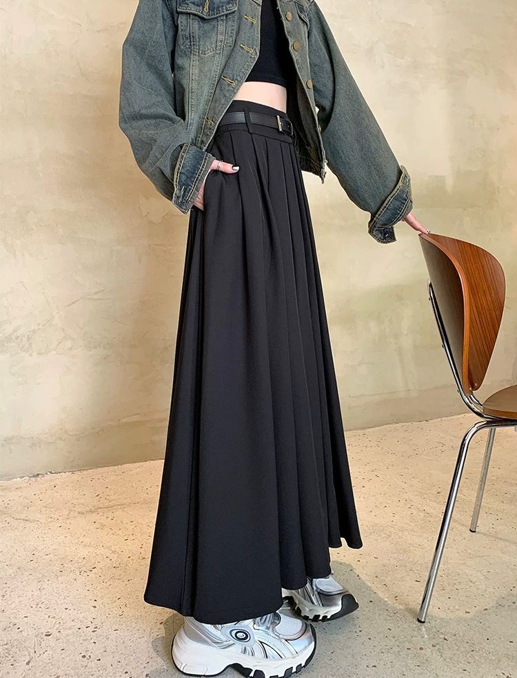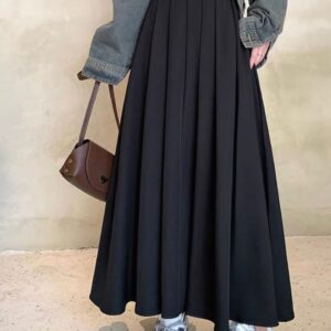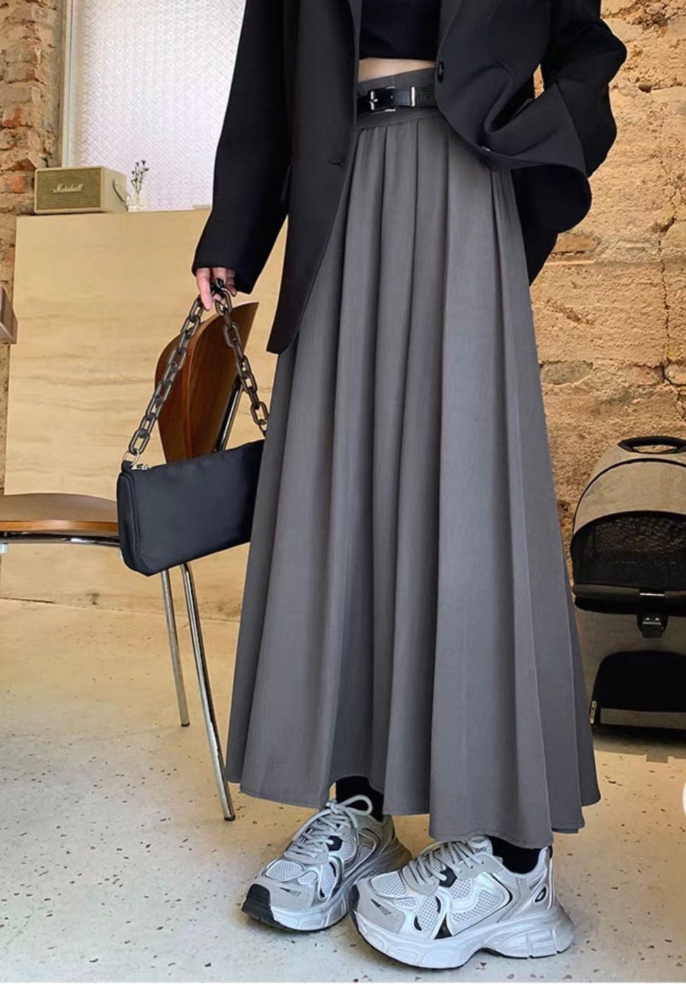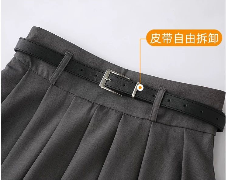 التصميم: تنورة بكسرات (Pleated) عريضة وواضحة، تأتي بقصة A-line (على شكل حرف A) التي تبرز الخصر وتنسدل باتجاه الأسفل، مع تصميم خصر مرتفع مزود بحلقات للحزام وحزام جلدي نحيف لإعطاء مظهر أكثر تحديداً.