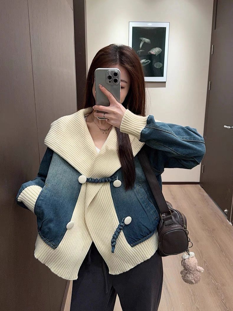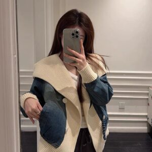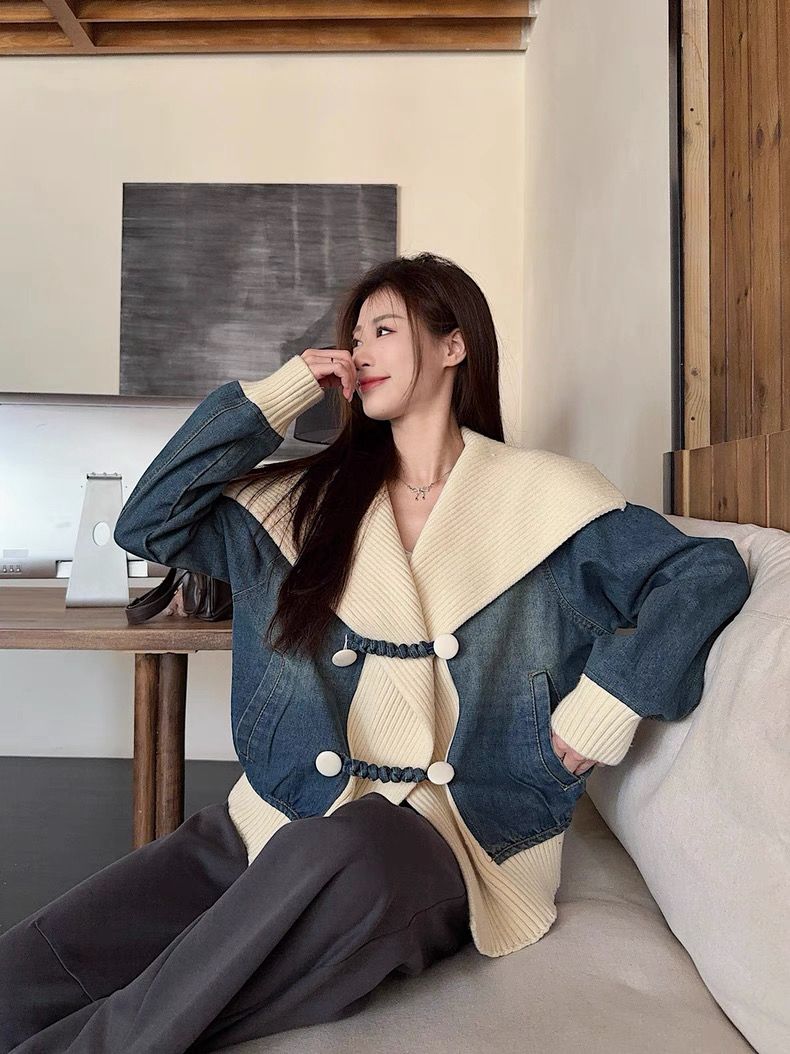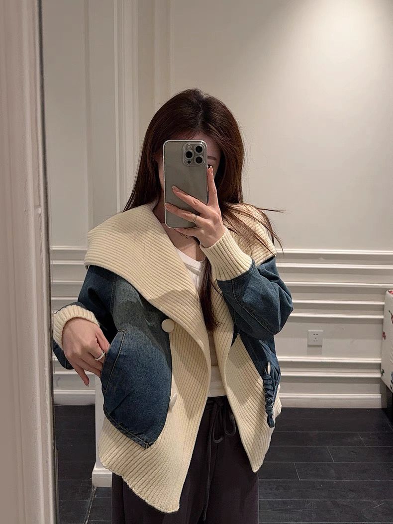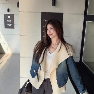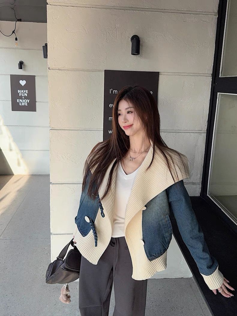 التصميم: فضفاض مع تفاصيل أزرار و جيوب , ياقة عريضة قابلة للطي أساور وحافة سفلية عريضة مضلعة (مصنوعة من التريكو السميك بلون كريمي
