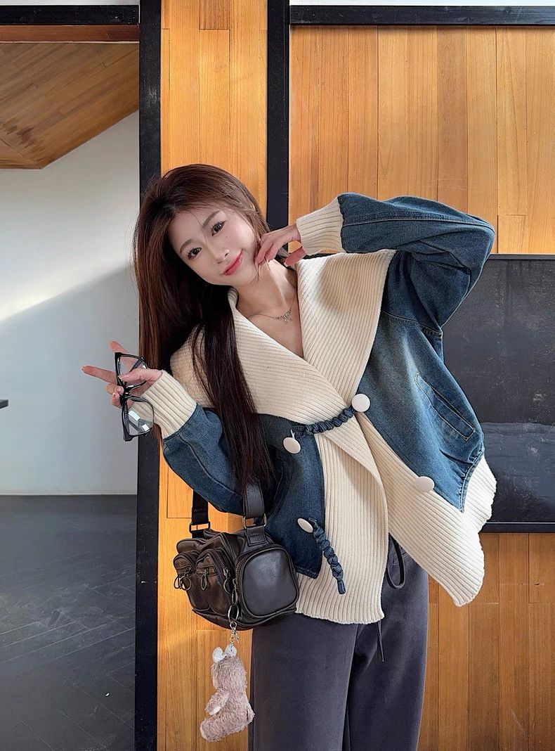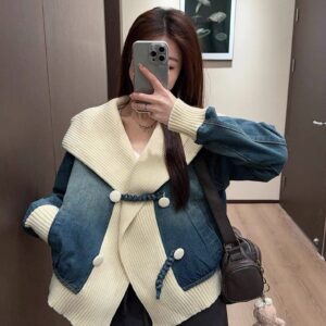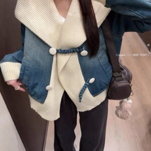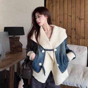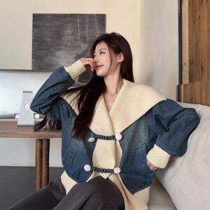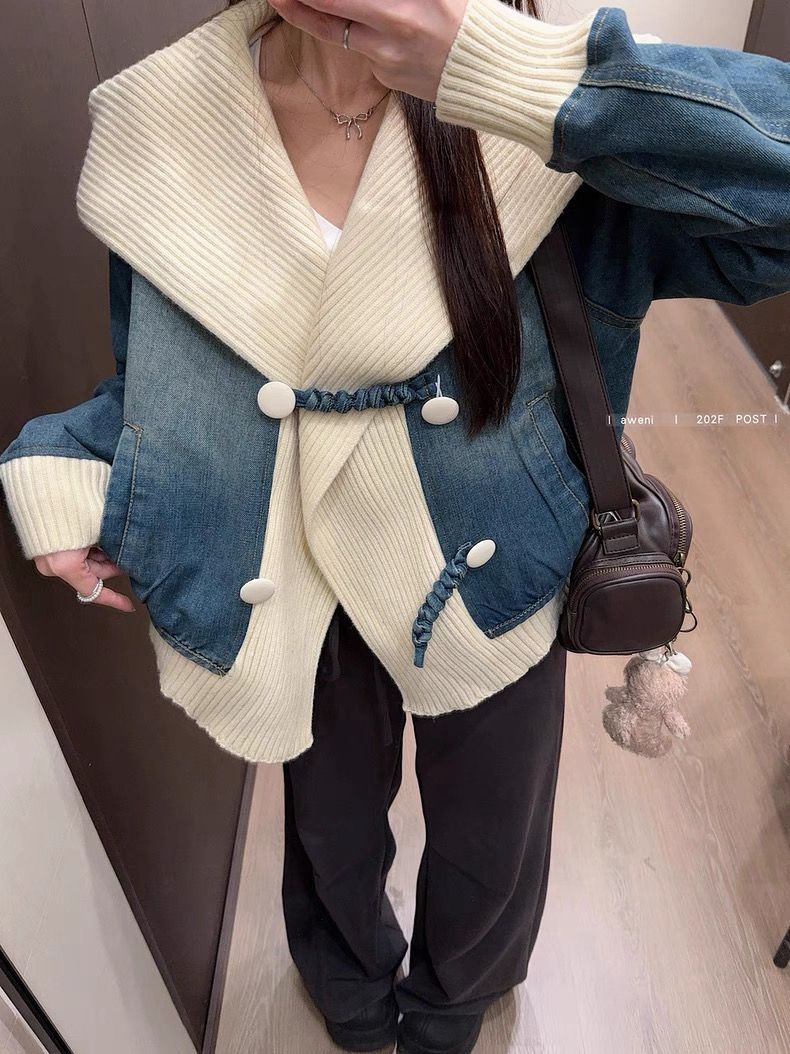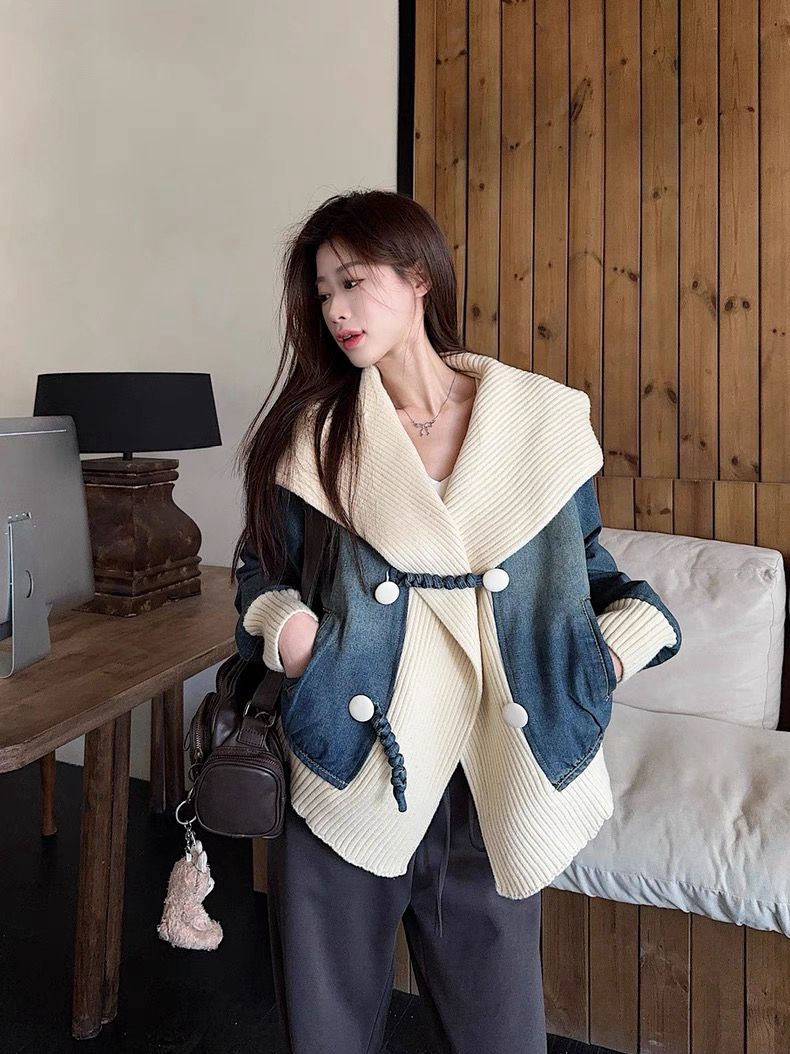 التصميم: فضفاض مع تفاصيل أزرار و جيوب , ياقة عريضة قابلة للطي أساور وحافة سفلية عريضة مضلعة (مصنوعة من التريكو السميك بلون كريمي