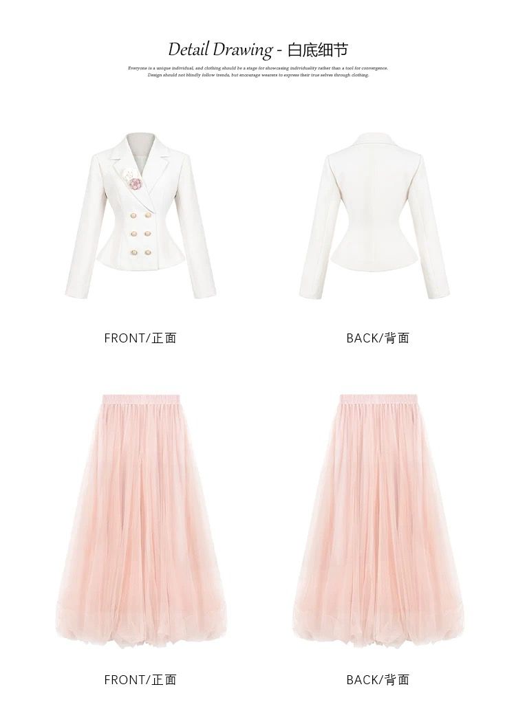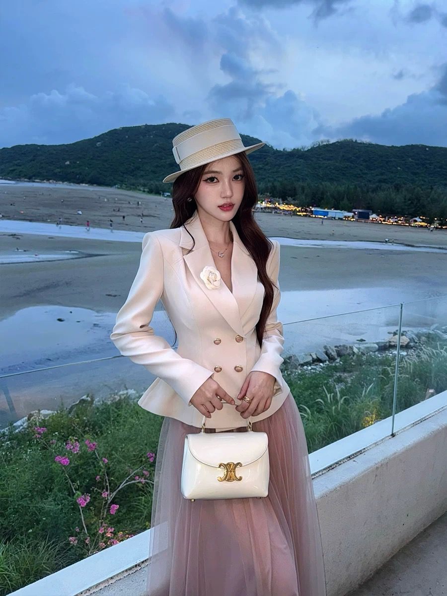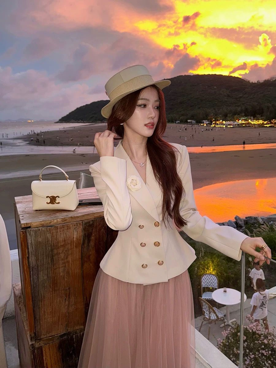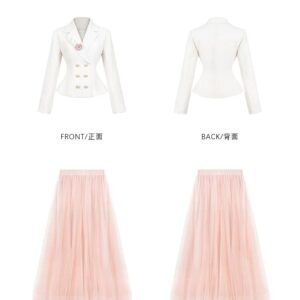 التصميم: جاكيت “بلايزر” بقصة خصر ضيقة (Slim-fit) بلون كريمي هادئ، يتميز بياقة رسمية مدببة وأزرار مزدوجة باللون الذهبي، مع لمسة جمالية عبارة عن وردة “كامليا” بيضاء على الصدر. تنسدل معه تنورة “تول” (Tulle) ناعمة بطبقات خفيفة بلون وردي باهت.