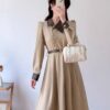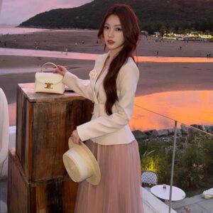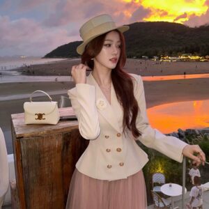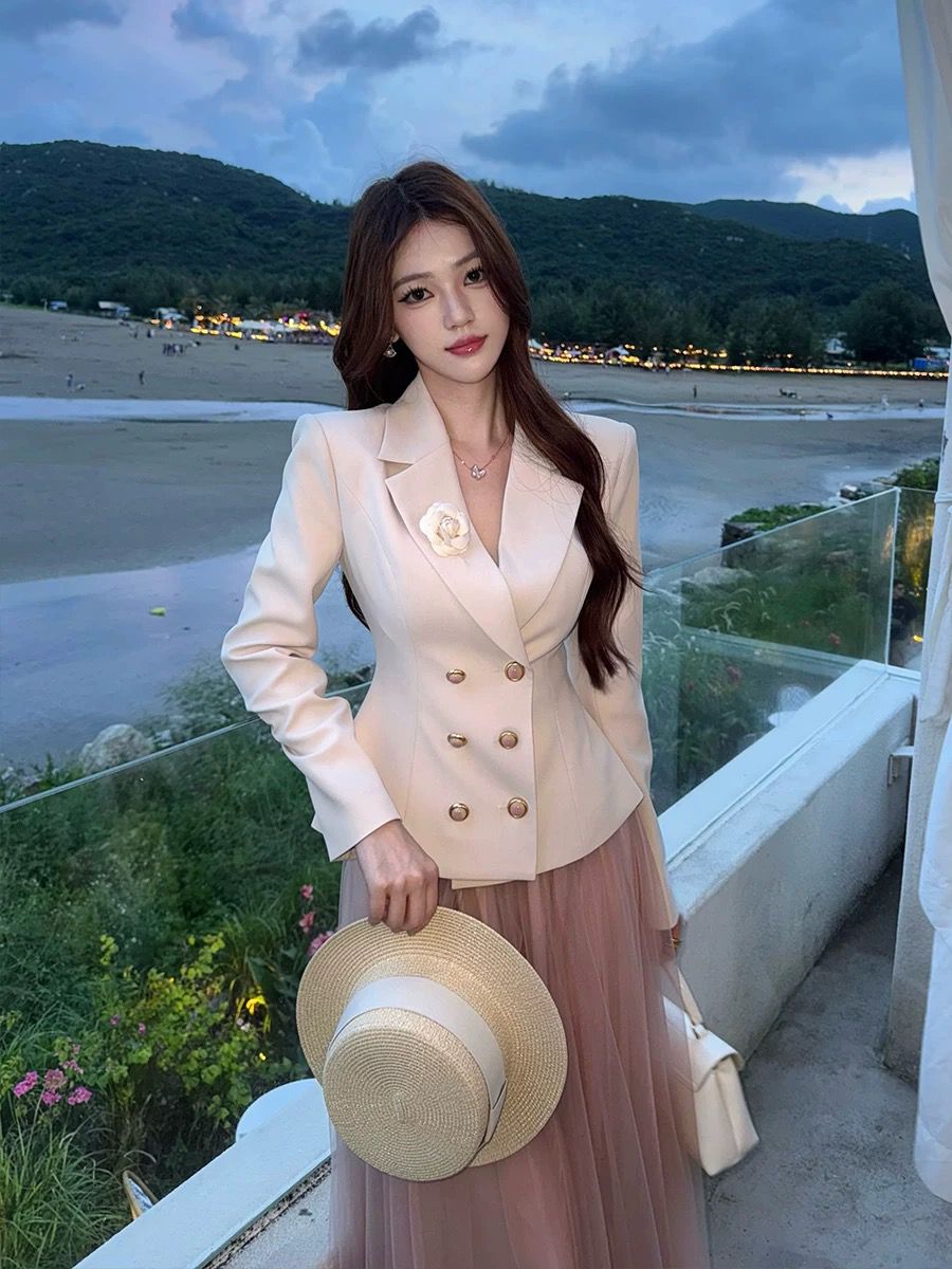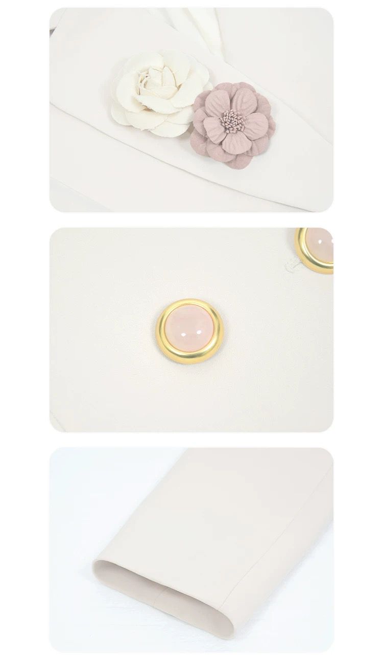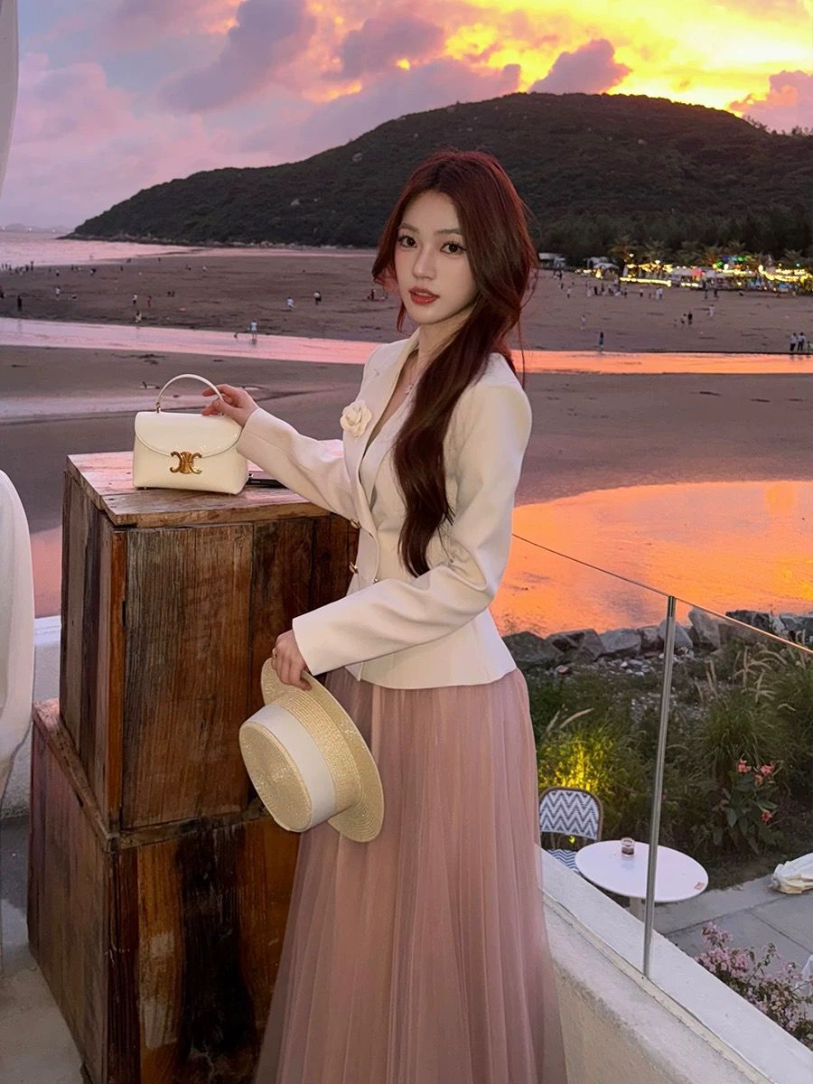 التصميم: جاكيت “بلايزر” بقصة خصر ضيقة (Slim-fit) بلون كريمي هادئ، يتميز بياقة رسمية مدببة وأزرار مزدوجة باللون الذهبي، مع لمسة جمالية عبارة عن وردة “كامليا” بيضاء على الصدر. تنسدل معه تنورة “تول” (Tulle) ناعمة بطبقات خفيفة بلون وردي باهت.
