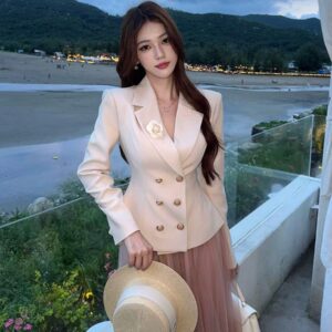 الأسلوب: نمط “الأناقة العصرية الفاخرة” (Modern Luxury)، يمزج بين حدة البلايزر الكلاسيكي ورقة التنانير الحالمة.