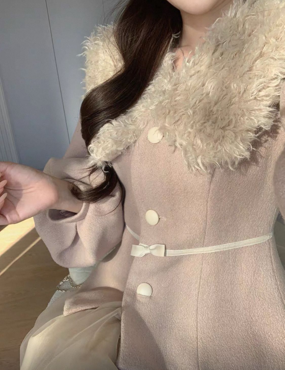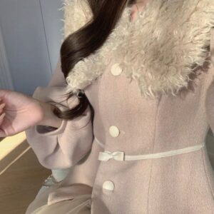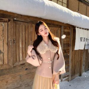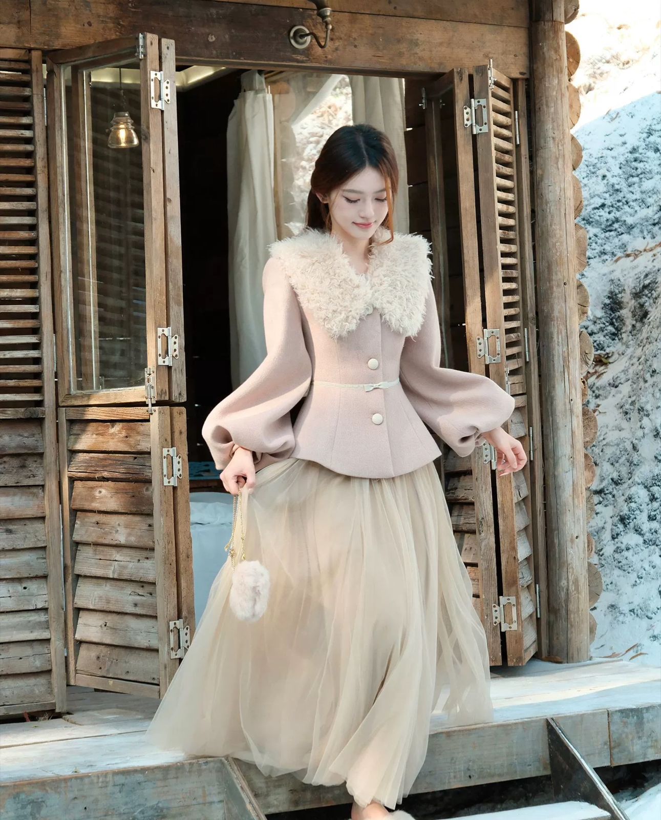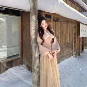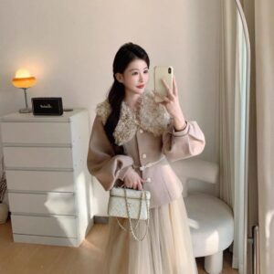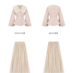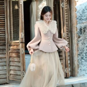 التصميم: طقم مكون من جاكيت صوفي بخصر محدد وأكمام منفوخة (Puff Sleeves) بأسلوب “اللانترن”، مزين بياقة من الفرو الصناعي الناعم وحزام خصر نحيل بفيونكة رقيقة. تنسدل معه تنورة من الشاش (Tulle) بطبقات متعددة تمنح مظهراً خيالياً.