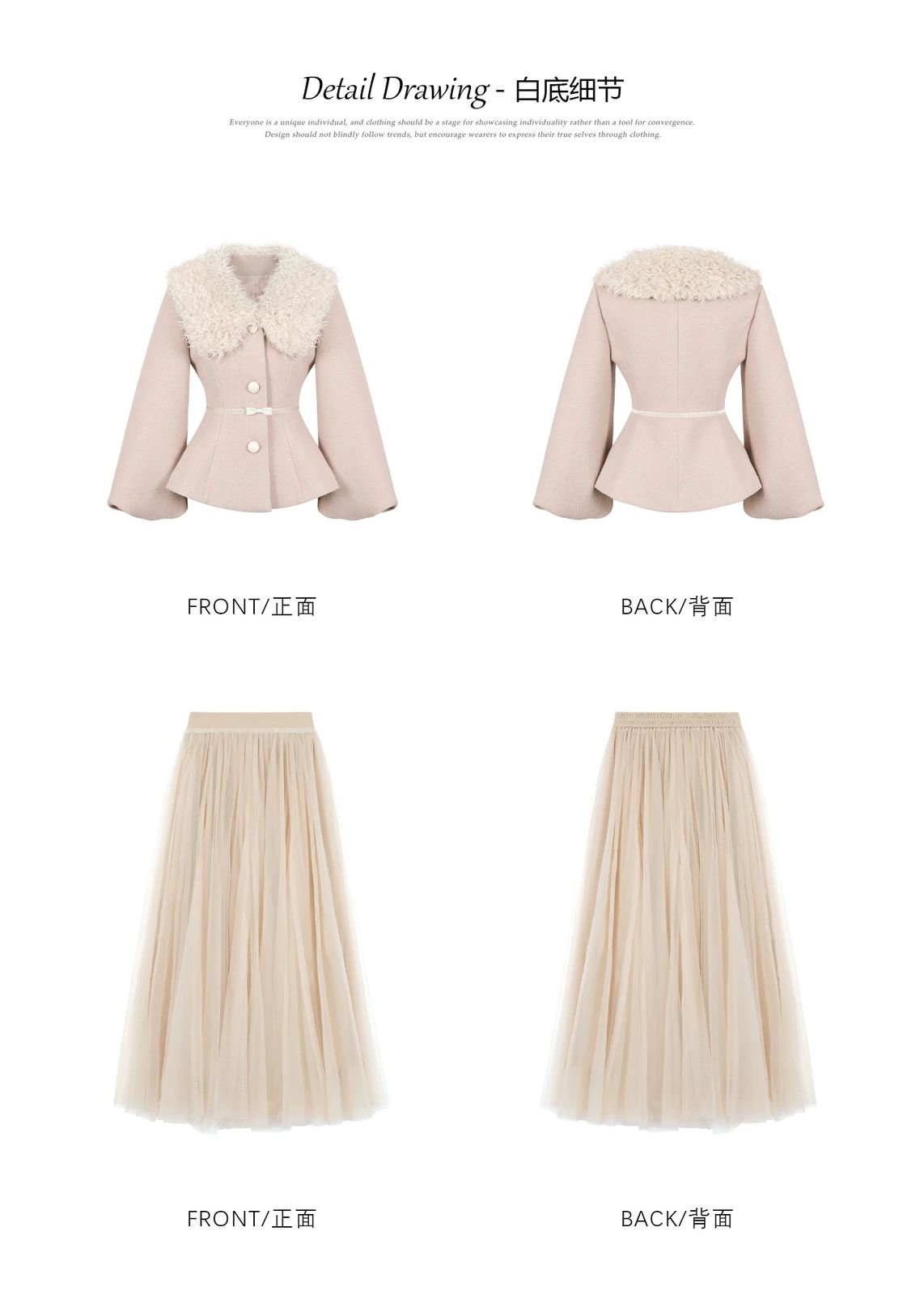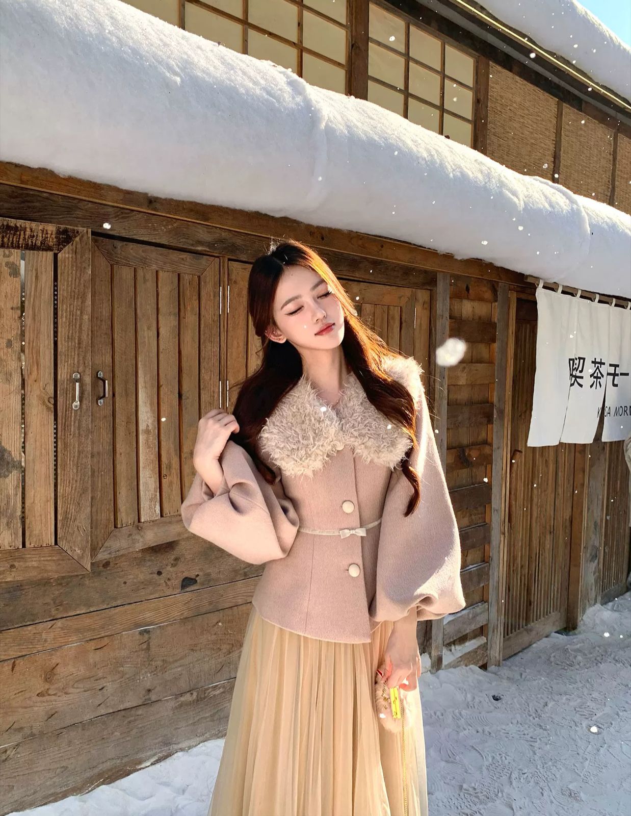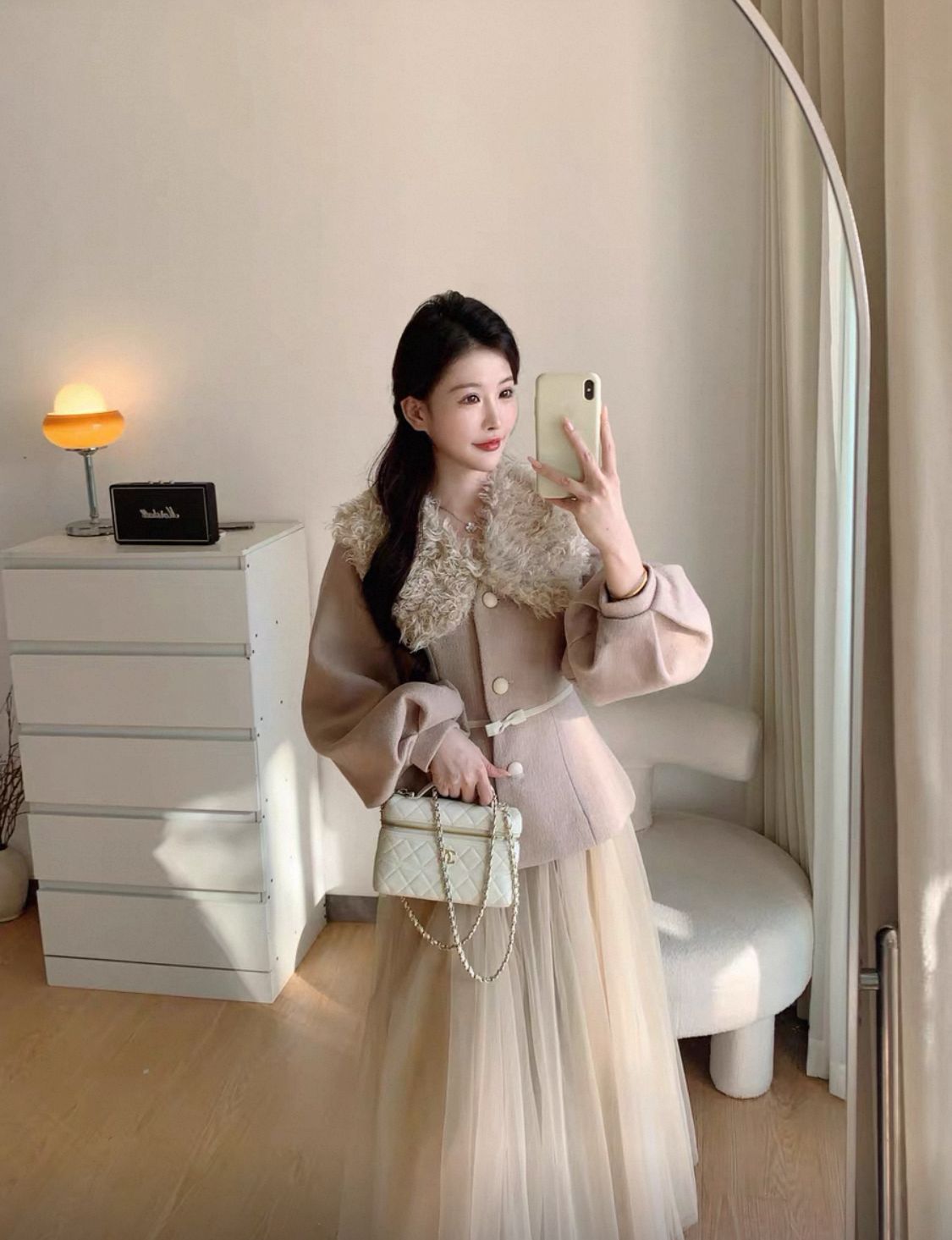 التصميم: طقم مكون من جاكيت صوفي بخصر محدد وأكمام منفوخة (Puff Sleeves) بأسلوب “اللانترن”، مزين بياقة من الفرو الصناعي الناعم وحزام خصر نحيل بفيونكة رقيقة. تنسدل معه تنورة من الشاش (Tulle) بطبقات متعددة تمنح مظهراً خيالياً.