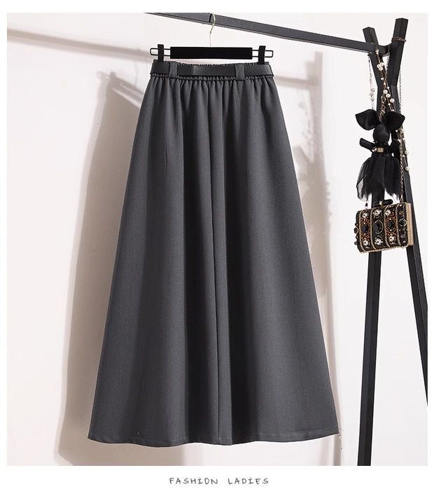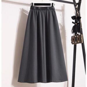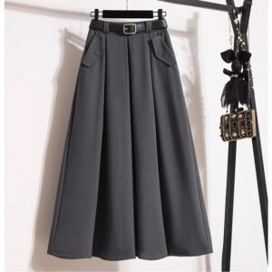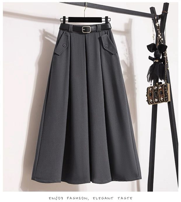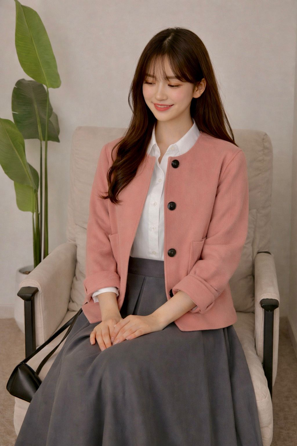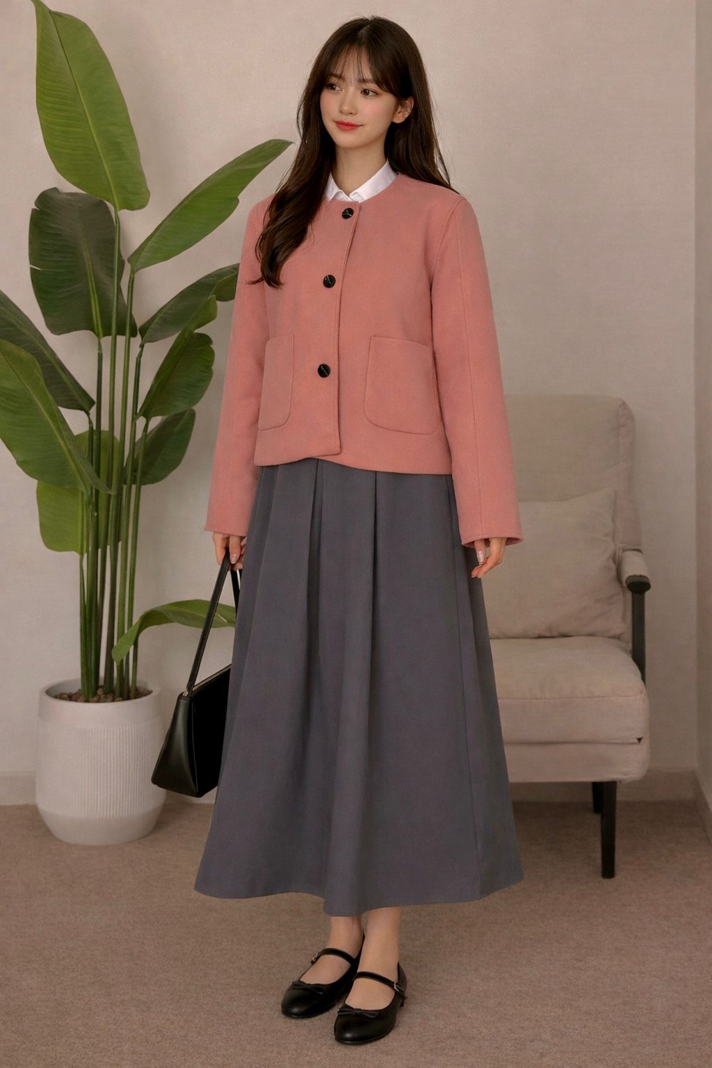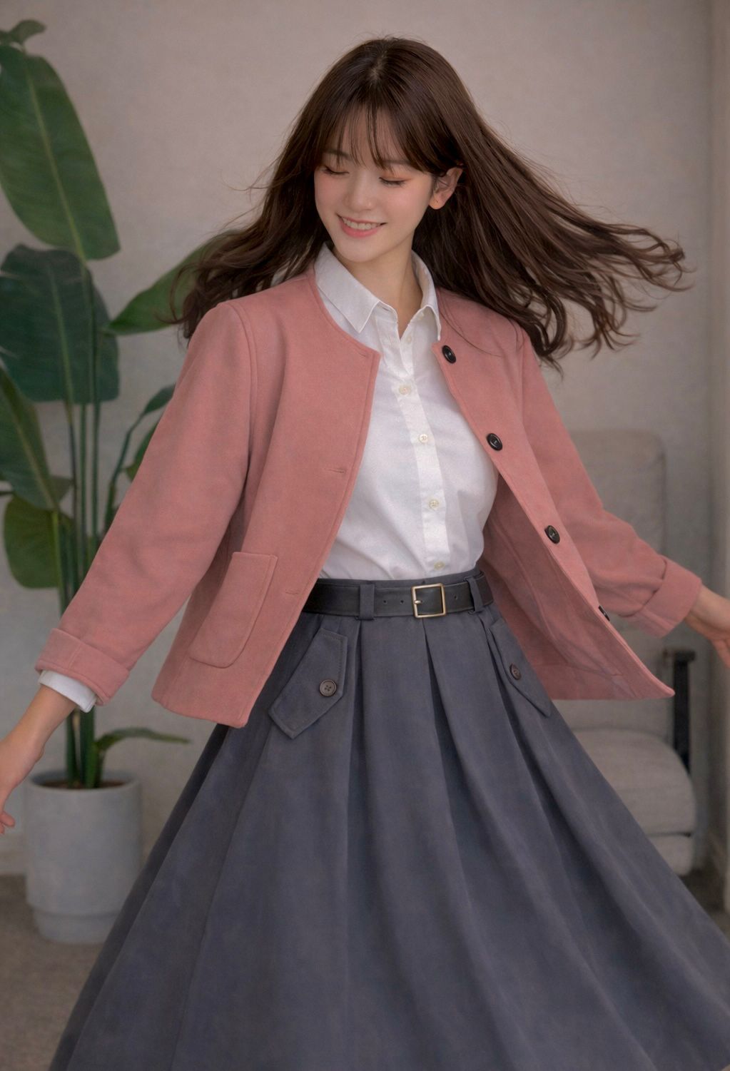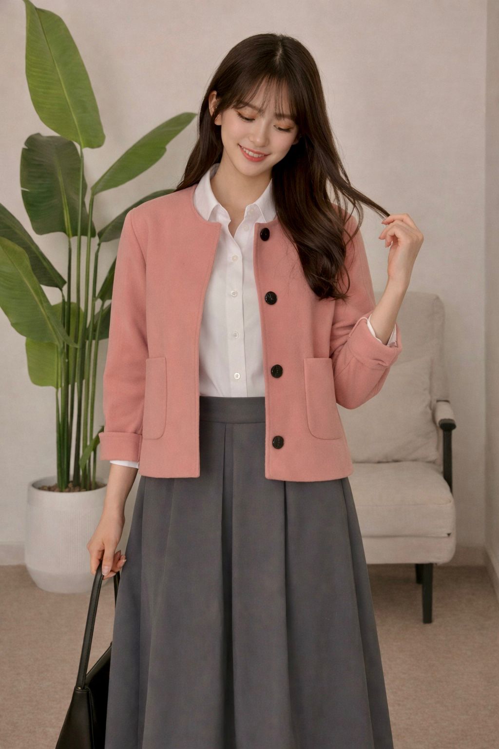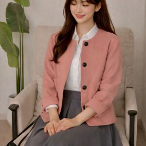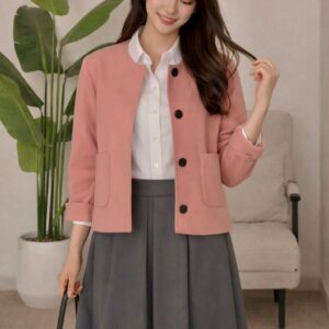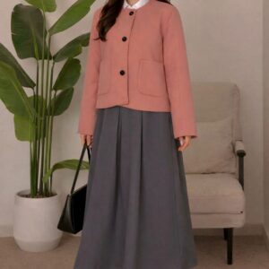جاكيت وردي بقصّة مستقيمة مع أزرار أمامية، منسّق مع تنورة رمادية طويلة بثنيات خفيفة وحزام أسود يحدد الخصر ويمنح الطقم توازناً راقياً.