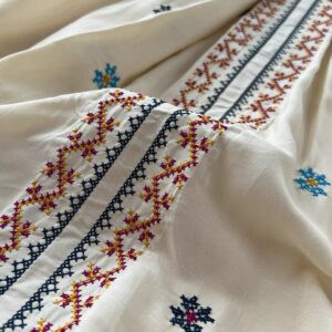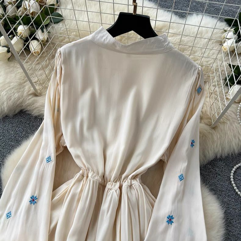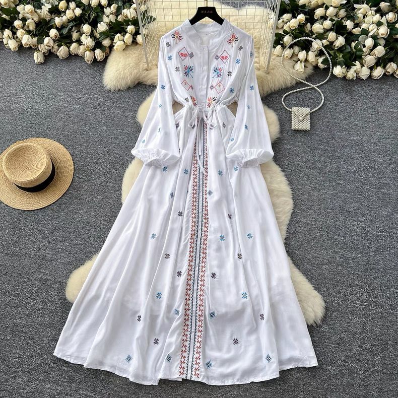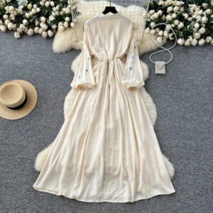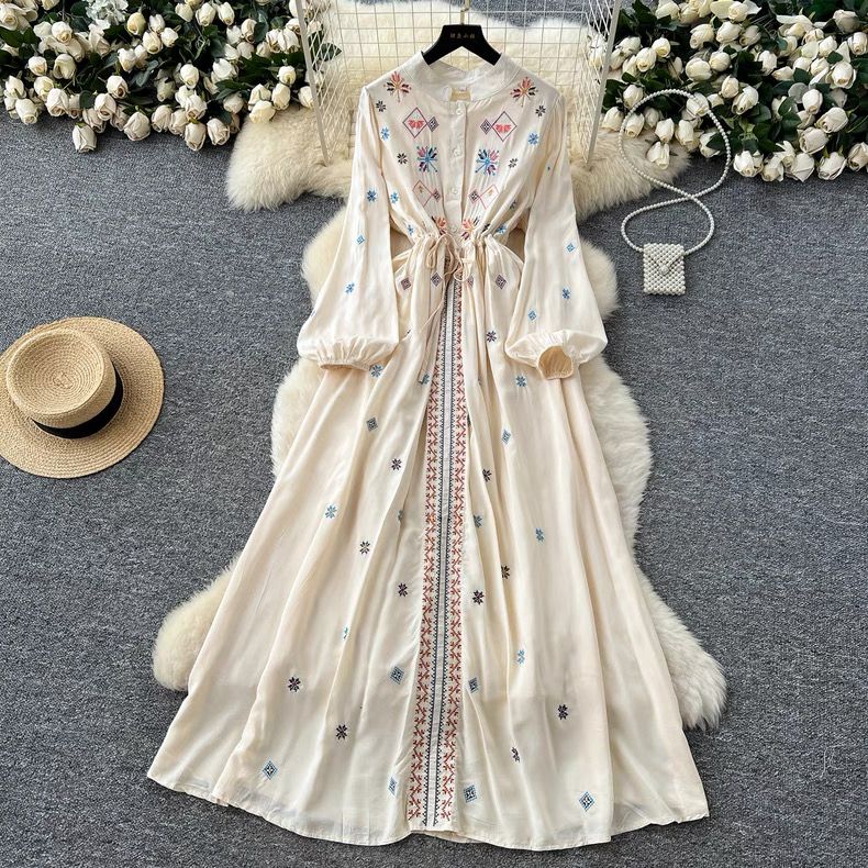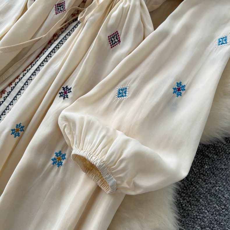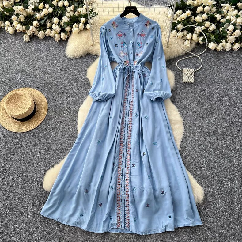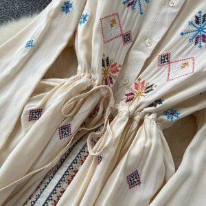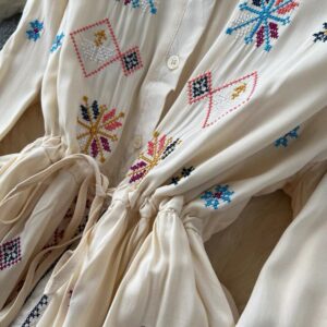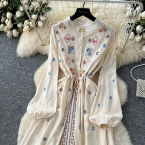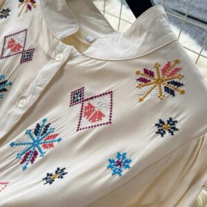 التصميم: فستان بقصة ناعمة , مطرزة, ياقة مرتفعة تناسب لاطلالة محتشمة ، أكمام منتفخة , حزام للتحكم بالخصر , أزرار في الجزء العلوي