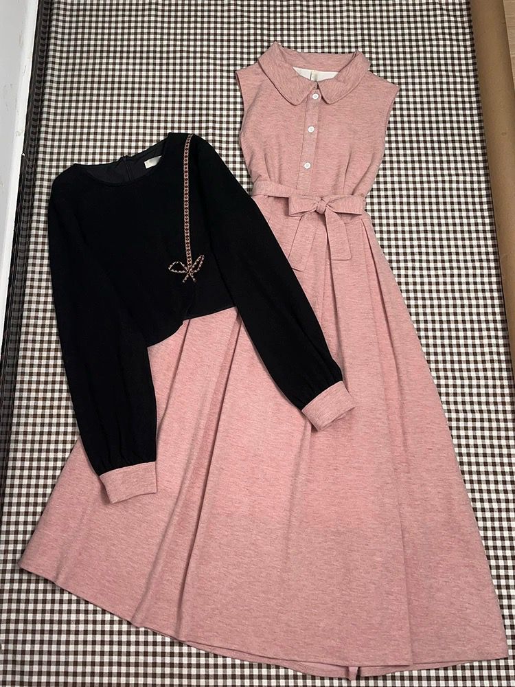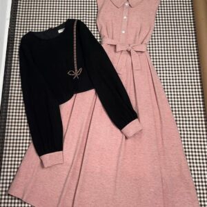 التصميم: فستان “A-line” بياقة مطوية وأزرار أمامية مع حزام خصر، ترافقه سترة قصيرة (بوليرو) مزينة بتطريز خيطي على شكل فيونكة وأطراف أكمام وردية متطابقة.