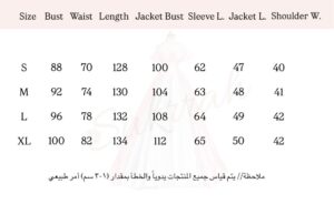طول الأكمام: أكمام طويلة (للسترة)، وبدون أكمام (للفستان الداخلي).