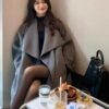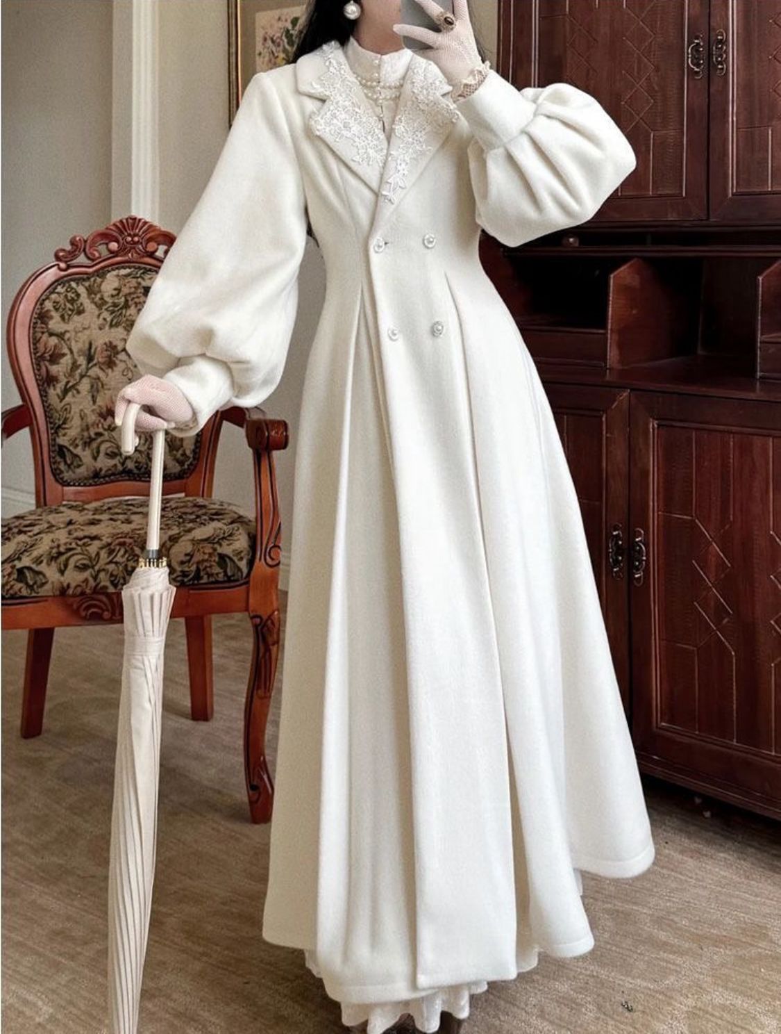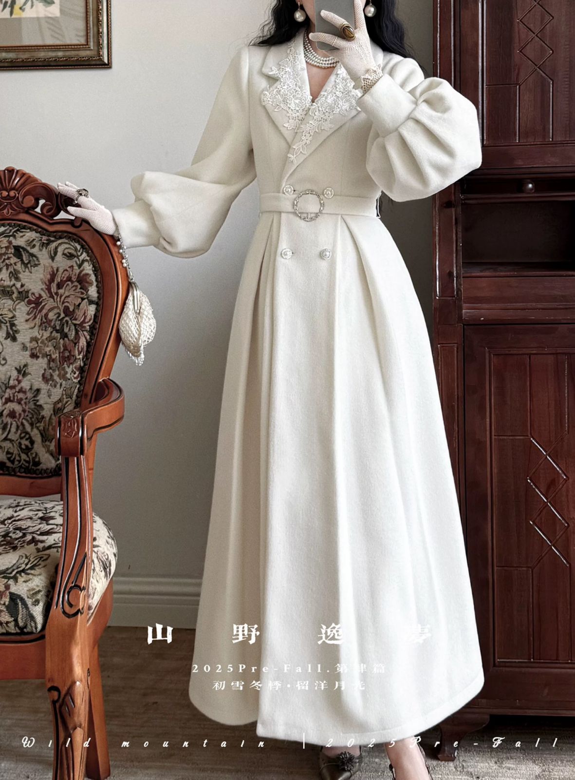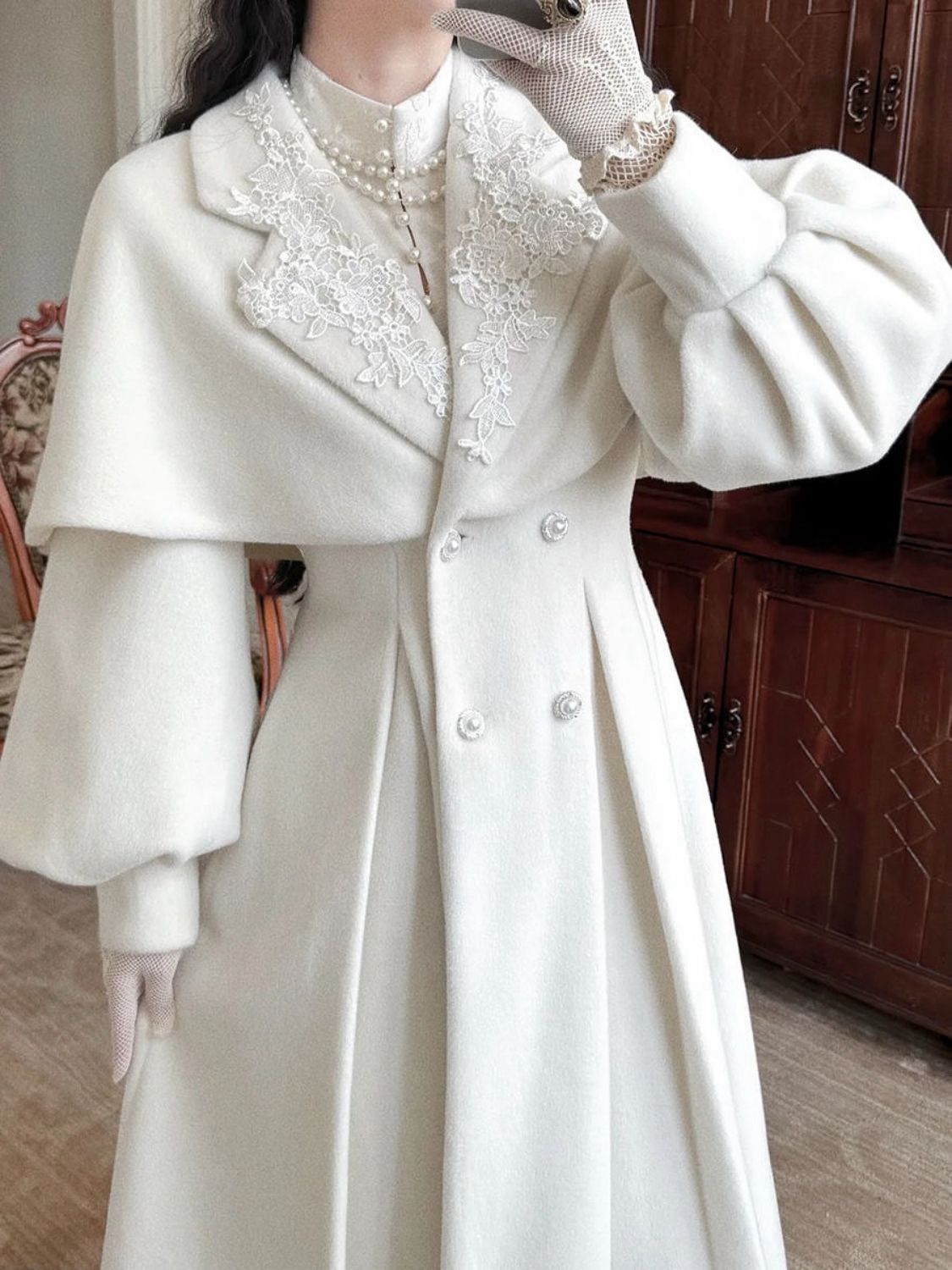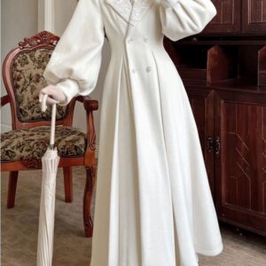 التصميم: معطف طويل بتفاصيل راقية من الدانتيل المطرز على الياقة الأمامية، مزود بشال منفصل يغطي الأكتاف لإضافة لمسة من الفخامة. الأزرار الأمامية مزخرفة بتفاصيل لؤلؤية تعزز الإحساس بالأناقة الهادئة